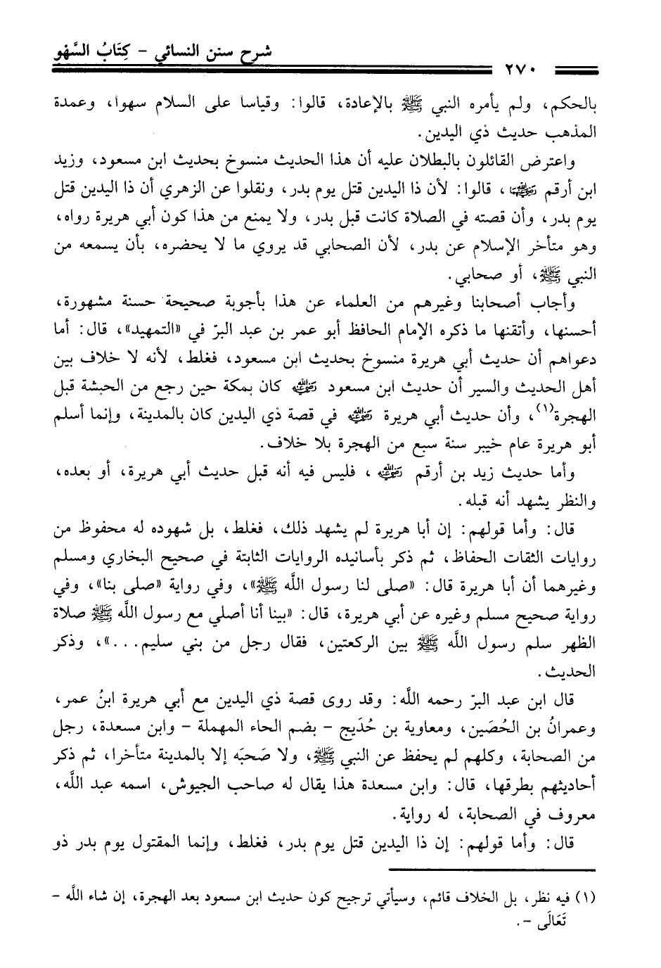 واعترض القائلون بالبطلان عليه أن هذا الحديث منسوخ بحديث ابن مسعود، وزيد ابن أرقم - رضي الله عنهما -، قالوا: لأن ذا اليدين قتل يوم بدر، ونقلوا عن الزهري أن ذا اليدين قتل يوم بدر، وأن قصته في الصلاة كانت قبل بدر, ولا يمنع من هذا كون أبي هريرة رواه، وهو متأخر الإسلام عن بدر، لأن الصحابي قد يروي ما لا يحضره، بأن يسمعه من النبي - صلى الله عليه وسلم -، أو صحابي.