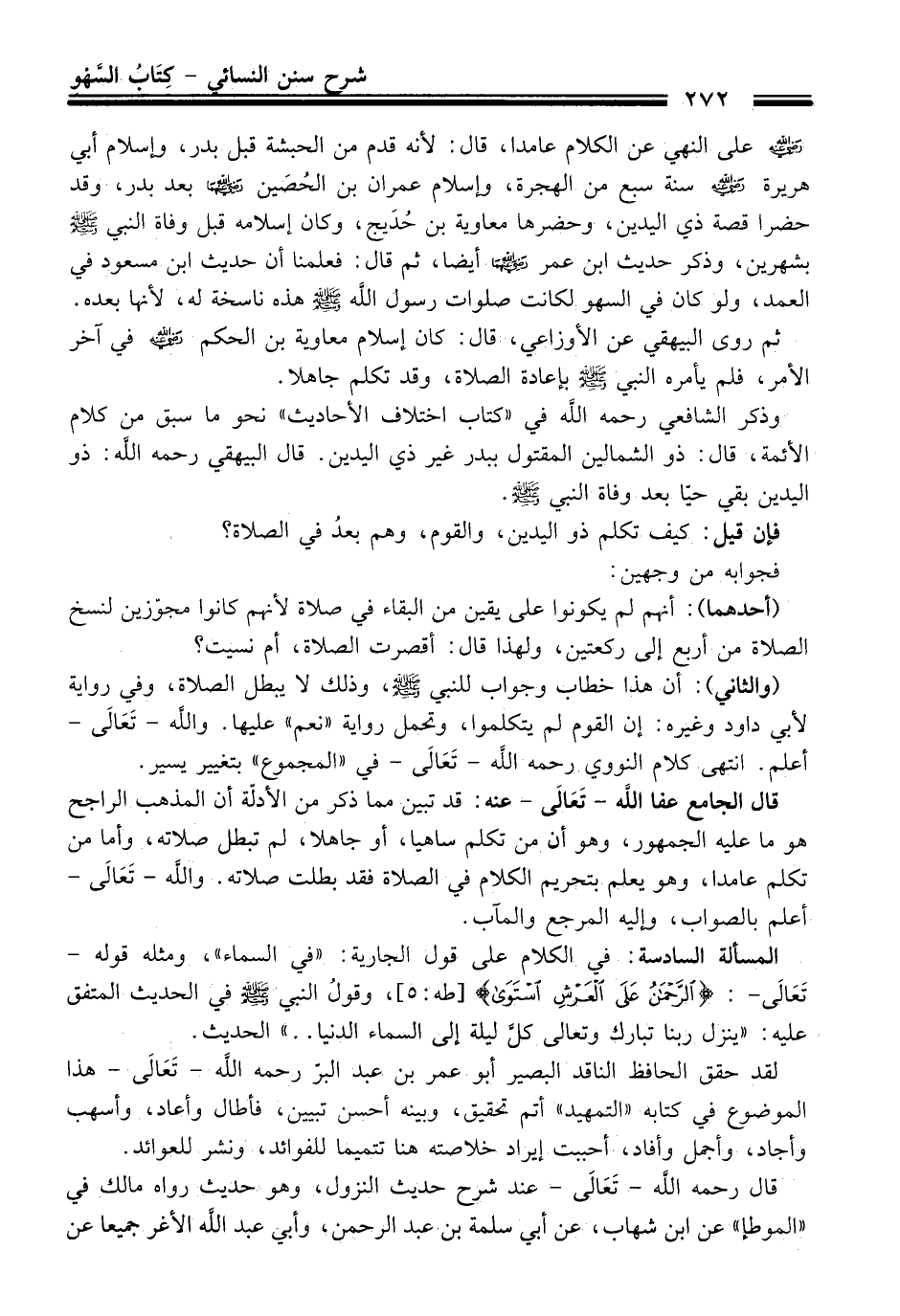 - رضي الله عنه - على النهي عن الكلام عامدا، قال: لأنه قدم من الحبشة قبل بدر، وإسلام أبي هريرة - رضي الله عنه - سنة سبع من الهجرة، وإسلام عمران بن الحُصَين - رضي الله عنهما - بعد بدر، وقد حضرا قصة ذي اليدين، وحضرها معاوية بن حُدَيج، وكان إسلامه قبل وفاة النبي - صلى الله عليه وسلم - بشهرين، وذكر حديث ابن عمر - رضي الله عنهما - أيضا، ثم قال: فعلمنا أن حديث ابن مسعود في العمد، ولو كان في السهو لكانت صلوات رسول الله - صلى الله عليه وسلم - هذه ناسخة له، لأنها بعده.