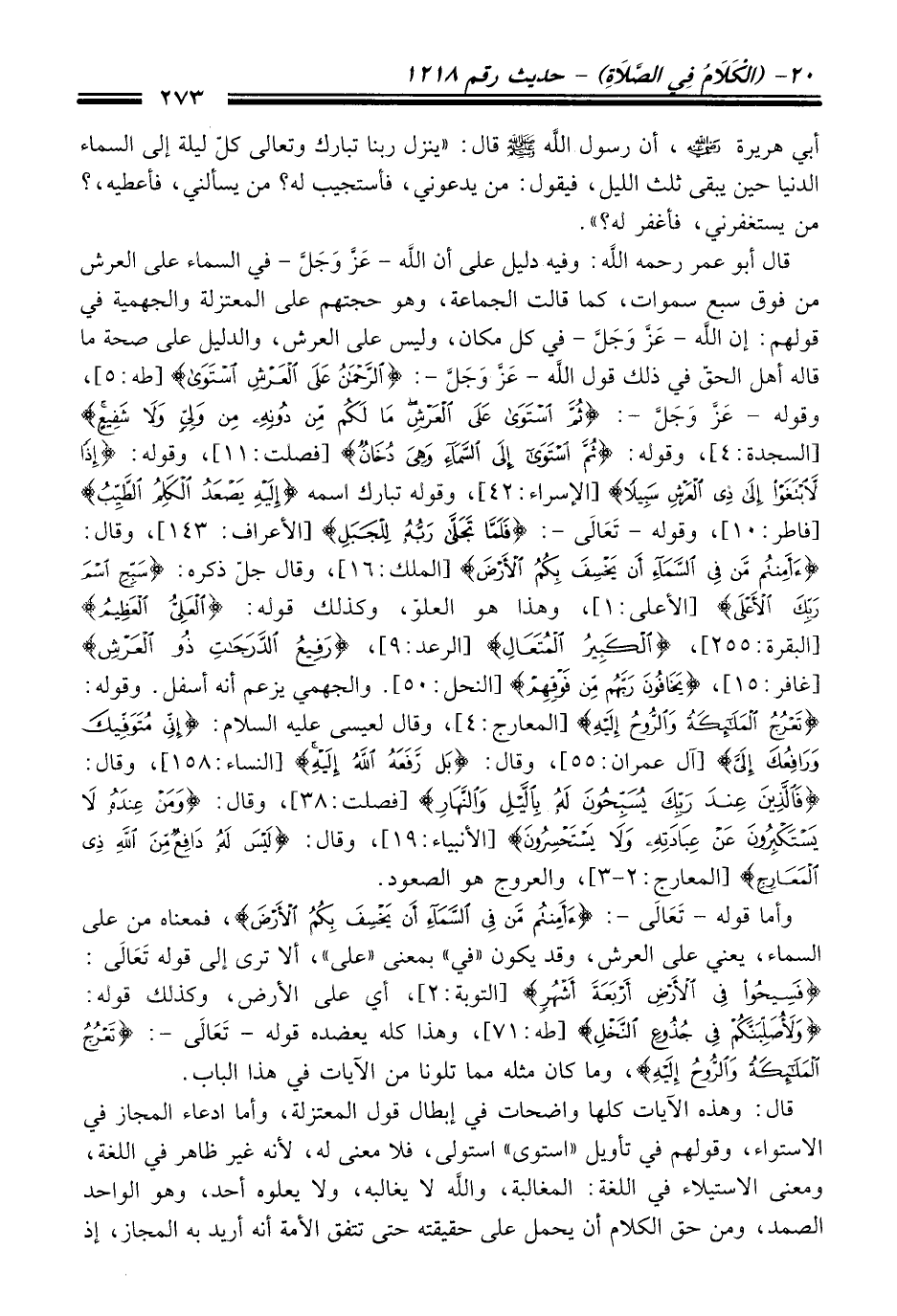 قال أبو عمر رحمه الله: وفيه دليل على أن الله -عَزَّ وَجَلَّ- في السماء على العرش من فوق سبع سموات، كما قالت الجماعة، وهو حجتهم على المعتزلة والجهمية في قولهم: إن الله -عَزَّ وَجَلَّ- في كل مكان، وليس على العرش، والدليل على صحة ما قاله أهل الحقّ في ذلك قول الله -عَزَّ وَجَلَّ-: {الرَّحْمَنُ عَلَى الْعَرْشِ اسْتَوَى} [طه: 5]، وقوله -عَزَّ وَجَلَّ-: {ثُمَّ اسْتَوَى عَلَى الْعَرْشِ مَا لَكُمْ مِنْ دُونِهِ مِنْ وَلِيٍّ وَلَا شَفِيعٍ} [السجدة: 4]، وقوله: {ثُمَّ اسْتَوَى إِلَى السَّمَاءِ وَهِيَ دُخَانٌ} [فصلت: 11]، وقوله: {إِذًا لَابْتَغَوْا إِلَى ذِي الْعَرْشِ سَبِيلًا} [الإسراء: 42]، وقوله تبارك اسمه {إِلَيْهِ يَصْعَدُ الْكَلِمُ الطَّيِّبُ} [فاطر: 10]، وقوله -تَعَالَى-: {فَلَمَّا تَجَلَّى رَبُّهُ لِلْجَبَلِ} [الأعراف: 143] وقال: {أَأَمِنْتُمْ مَنْ فِي السَّمَاءِ أَنْ يَخْسِفَ بِكُمُ الْأَرْضَ} [الملك: 16]، وقال جلّ ذكره: {سَبِّحِ اسْمَ رَبِّكَ الْأَعْلَى} [الأعلى: 1]، وهذا هو العلوّ، وكذلك قوله: {الْعَلِيُّ الْعَظِيمُ} [البقرة: 255]، {الْكَبِيرُ الْمُتَعَالِ} [الرعد: 9]، {رَفِيعُ الدَّرَجَاتِ ذُو الْعَرْشِ} [غافر: 15]، {يَخَافُونَ رَبَّهُمْ مِنْ فَوْقِهِمْ} [النحل: 50]. والجهمي يزعم أنه أسفل. وقوله: {تَعْرُجُ الْمَلَائِكَةُ وَالرُّوحُ إِلَيْهِ} [المعارج: 4]، وقال لعيسى عليه السلام: {إِنِّي مُتَوَفِّيكَ وَرَافِعُكَ} [آل عمران: 55]، وقال: {بَلْ رَفَعَهُ اللَّهُ إِلَيْهِ} [النساء: 158]، وقال: {فَالَّذِينَ عِنْدَ رَبِّكَ يُسَبِّحُونَ لَهُ بِاللَّيْلِ وَالنَّهَارِ} [فصلت: 38]، وقال. {وَمَنْ عِنْدَهُ لَا يَسْتَكْبِرُونَ عَنْ عِبَادَتِهِ وَلَا يَسْتَحْسِرُونَ} [الأنبياء: 19]، وقال: {مِنَ اللَّهِ ذِي الْمَعَارِجِ} [المعارج:2 - 3]، والعروج هو الصعود.