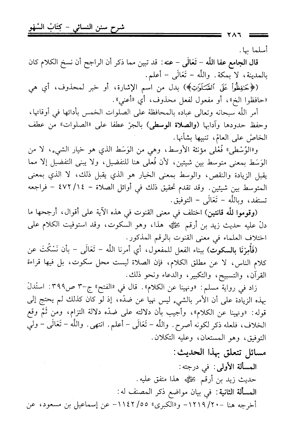 (وقوموا لله قانتين) اختلف في معنى القنوت في هذه الآية على أقوال، أرجحها ما دلّ عليه حديث زيد بن أرقم - رضي الله عنه - هذا، وهو السكوت، وقد استوفيت الكلام على اختلاف العلماء في معنى القنوت بالرقم المذكور.