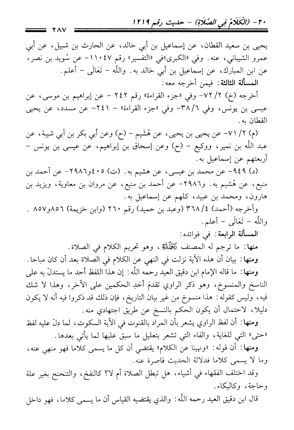 ومنها: أن لفظ الراوي يشعر بأن المراد بالقنوت في الآية السكوت، لما دلّ عليه لفظ "حتى" التي للغاية، والفاء التي تشعر بتعليل ما سبق عليها لما يأتي بعدها.