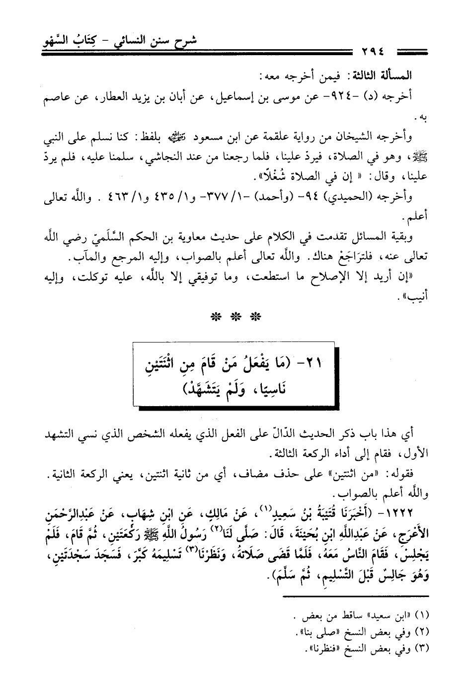1222 - (أَخْبَرَنَا قُتَيْبَةُ بْنُ سَعِيدٍ (¬1)، عَنْ مَالِكٍ، عَنِ ابْنِ شِهَابٍ، عَنْ عَبْدِ الرَّحْمَنِ الأَعْرَجِ، عَنْ عَبْدِ اللَّهِ ابْنِ بُحَيْنَةَ، قَالَ: صَلَّى لَنَا (¬2) رَسُولُ اللَّهِ - صلى الله عليه وسلم - رَكْعَتَيْنِ، ثُمَّ قَامَ، فَلَمْ يَجْلِسْ، فَقَامَ النَّاسُ مَعَهُ، فَلَمَّا قَضَى صَلاَتَهُ، وَنَظَرْنَا (¬3) تَسْلِيمَهُ كَبَّرَ، فَسَجَدَ سَجْدَتَيْنِ، وَهُوَ جَالِسٌ قَبْلَ التَّسْلِيمِ، ثُمَّ سَلَّمَ).