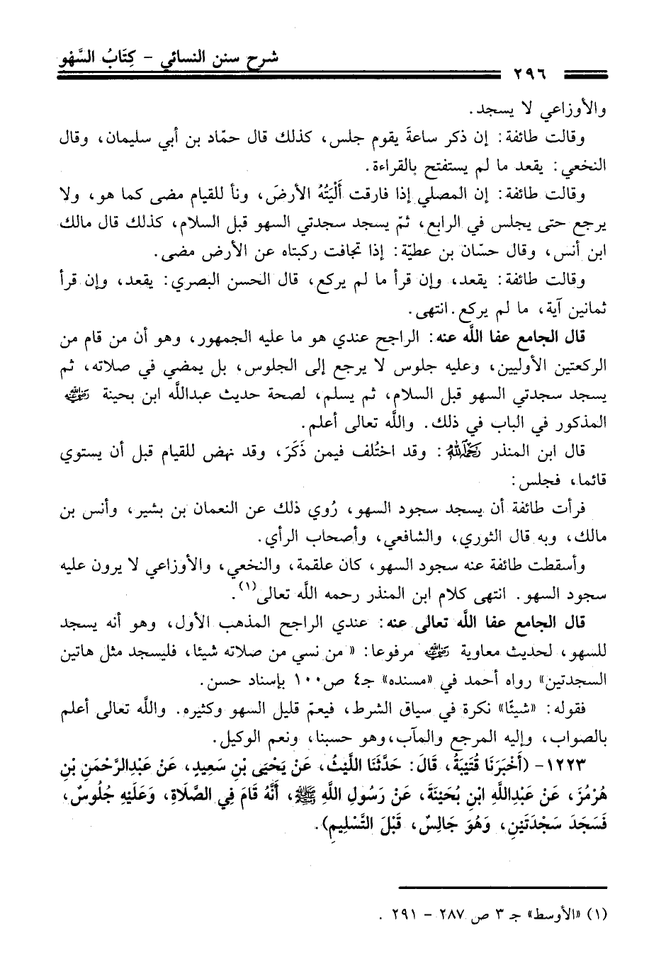 قال الجامع عفا الله تعالى عنه: عندي الراجح المذهب الأول، وهو أنه يسجد للسهو، لحديث معاوية - رضي الله عنه - مرفوعًا: "من نسي من صلاته شيئًا، فليسجد مثل هاتين السجدتين" رواه أحمد في "مسنده" جـ 4 ص 100 بإسناد حسن.