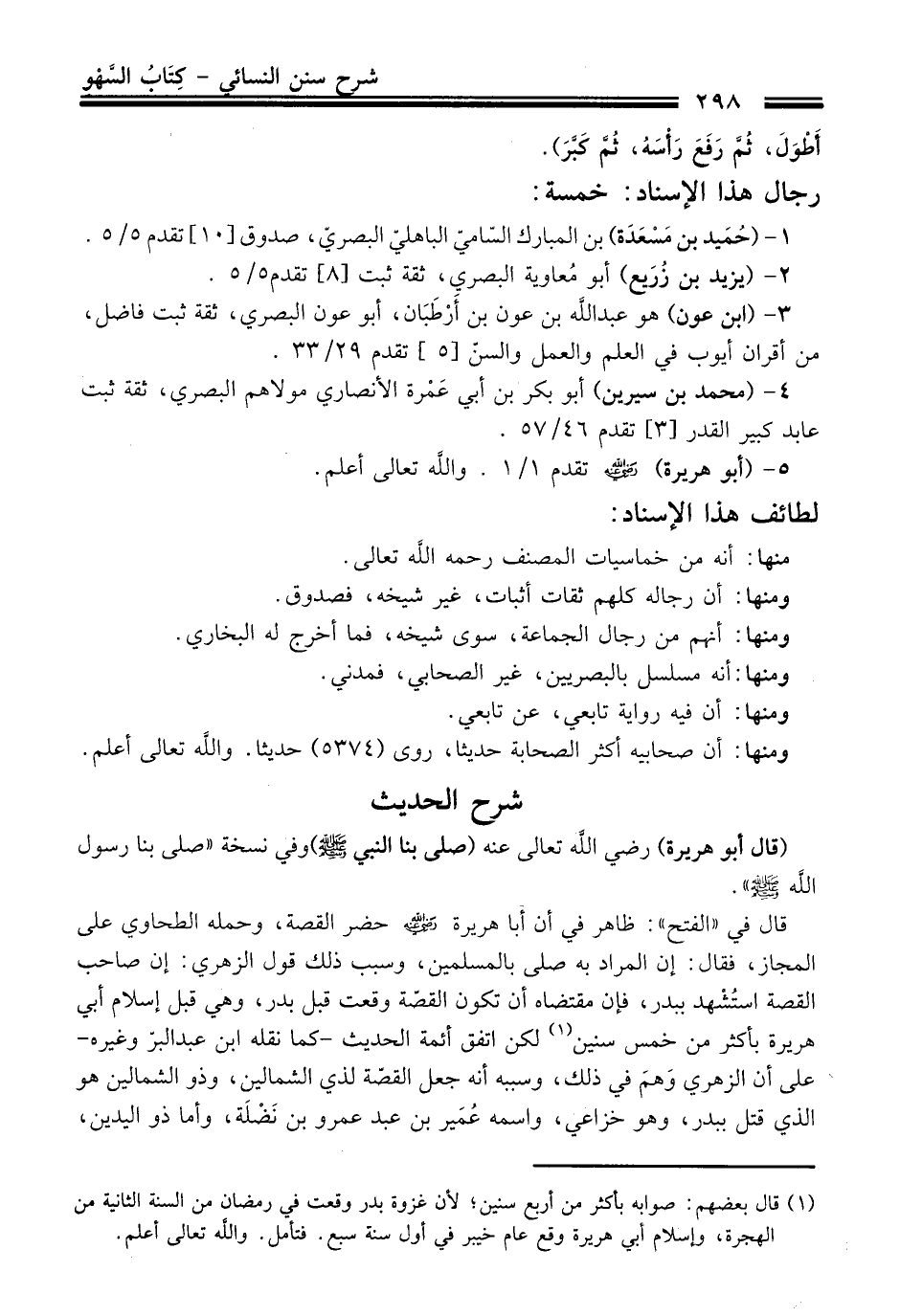 قال في "الفتح": ظاهر في أن أبا هريرة - رضي الله عنه - حضر القصة، وحمله الطحاوي على المجاز، فقال: إن المراد به صلى بالمسلمين، وسبب ذلك قول الزهري: إن صاحب القصة استُشْهد ببدر، فإن مقتضاه أن تكون القضة وقعت قبل بدر، وهي قبل إسلام أبي هريرة بأكثر من خمس سنين (¬1) لكن اتفق أئمة الحديث -كما نقله ابن عبد البرّ وغيره- على أن الزهري وَهمَ في ذلك، وسببه أنه جعل القصّة لذي الشمالين، وذو الشمالين هو الذي قتل ببدر، وهو خزاعي، واسمه عُمَير بن عبد عمرو بن نَضْلَة، وأما ذو اليدين،