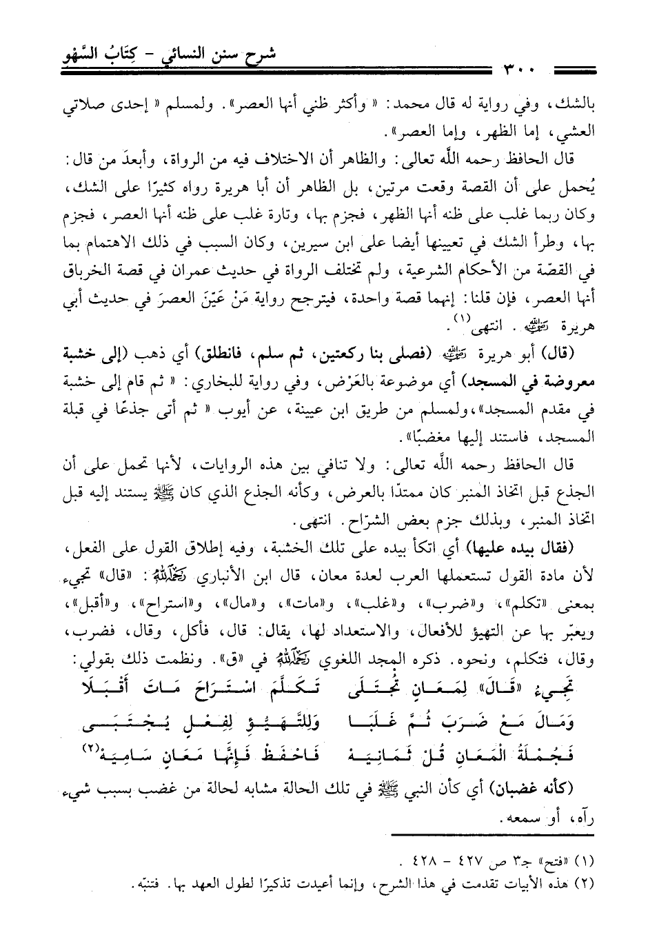 (قال) أبو هريرة - رضي الله عنه - (فصلى بنا ركعتين، ثم سلم، فانطلق) أي ذهب (إلى خشبة معروضة في المسجد) أي موضوعة بالعَرْض، وفي رواية للبخاري: "ثم قام إلى خشبة في مقدم المسجد"، ولمسلم من طريق ابن عيينة، عن أيوب "ثم أتى جذعًا في قبلة المسجد، فاستند إليها مغضبًا".