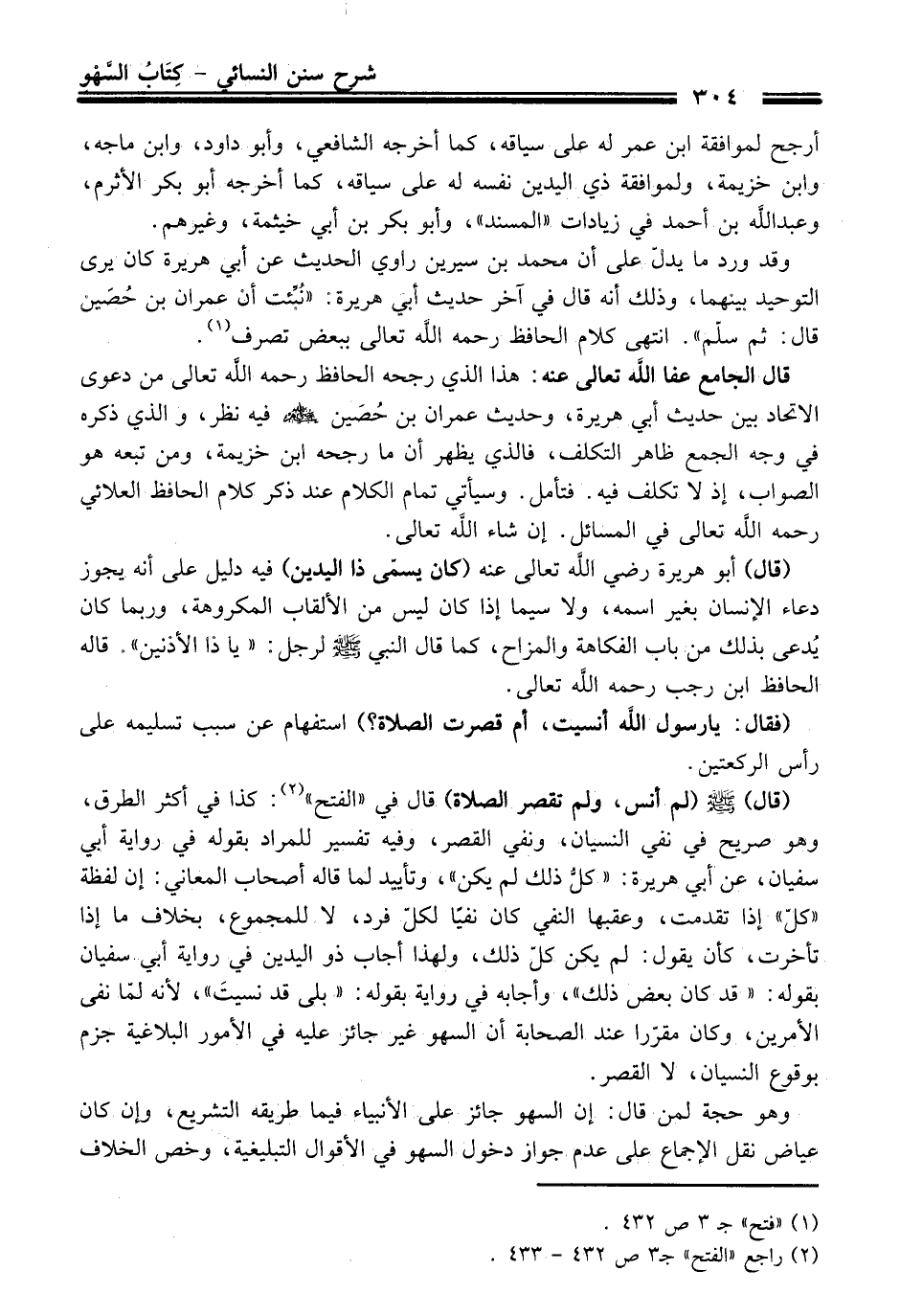 قال الجامع عفا الله تعالى عنه: هذا الذي رجحه الحافظ رحمه الله تعالى من دعوى الاتحاد بين حديث أبي هريرة، وحديث عمران بن حُصين - رضي الله عنهم - فيه نظر، والذي ذكره في وجه الجمع ظاهر التكلف، فالذي يظهر أن ما رجحه ابن خزيمة، ومن تبعه هو الصواب، إذ لا تكلف فيه. فتأمل. وسيأتي تمام الكلام عند ذكر كلام الحافظ العلائي رحمه الله تعالى في المسائل. إن شاء الله تعالى.