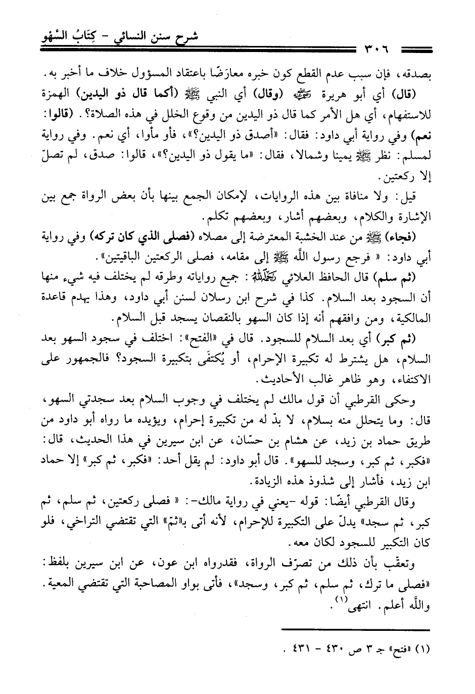 وحكى القرطبي أن قول مالك لم يختلف في وجوب السلام بعد سجدتي السهو، قال: وما يتحلل منه بسلام، لابدّ له من تكبيرة إحرام، ويؤيده ما رواه أبو داود من طريق حماد بن زيد، عن هشام بن حسّان، عن ابن سيرين في هذا الحديث، قال: "فكبر، ثم كبر، وسجد للسهو". قال أبو داود: لم يقل أحد: "فكبر، ثم كبر" إلا حماد ابن زيد، فأشار إلى شذوذ هذه الزيادة.