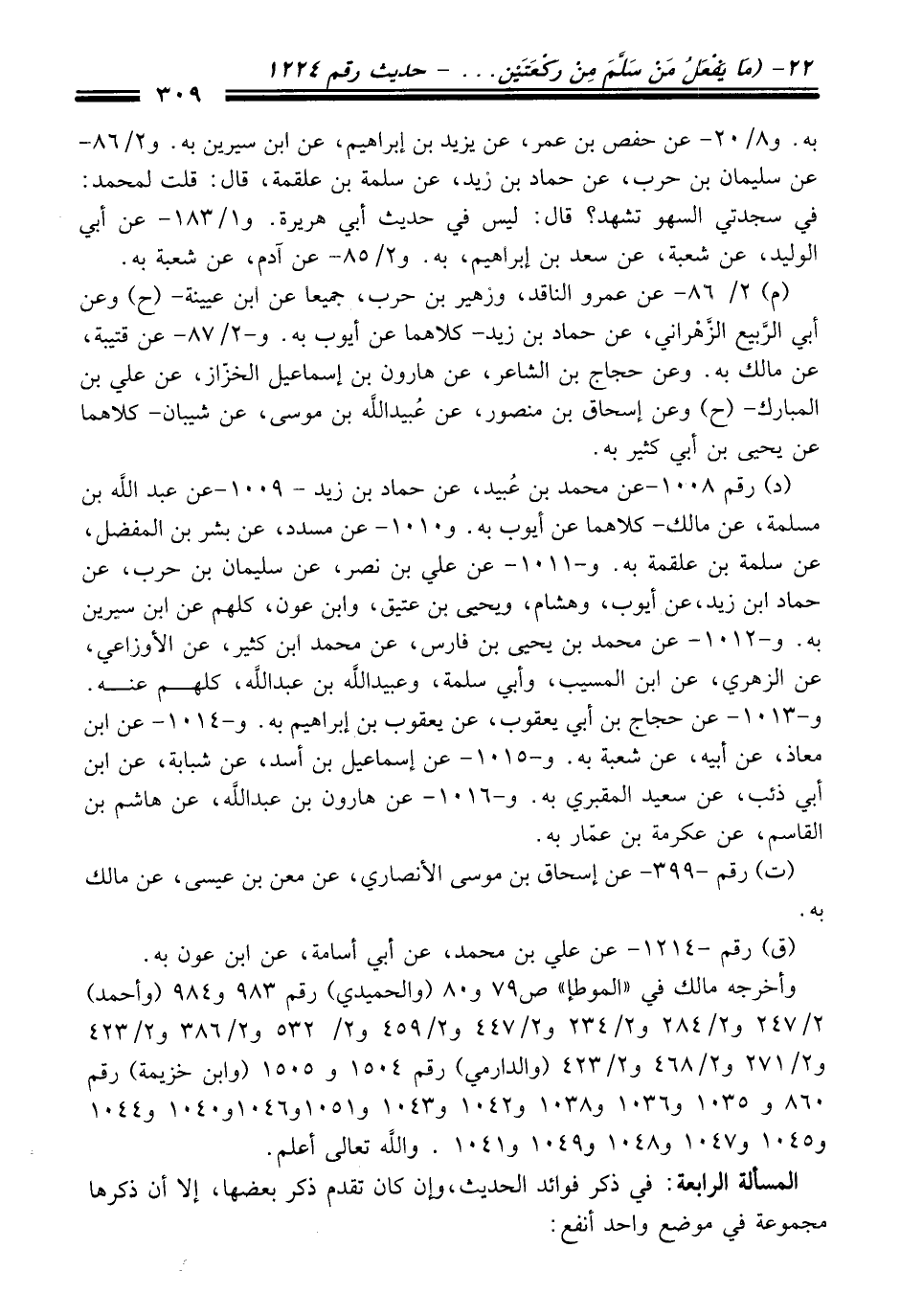 به. و 8/ 20 - عن حفص بن عمر، عن يزيد بن إبراهيم, عن ابن سيرين به. و 2/ 86 - عن سليمان بن حرب، عن حماد بن زيد، عن سلمة بن علقمة، قال: قلت لمحمد: في سجدتي السهو تشهد؟ قال: ليس في حديث أبي هريرة. و 1/ 183 - عن أبي الوليد، عن شعبة، عن سعد بن إبراهيم، به. و 2/ 85 - عن آدم، عن شعبة به.