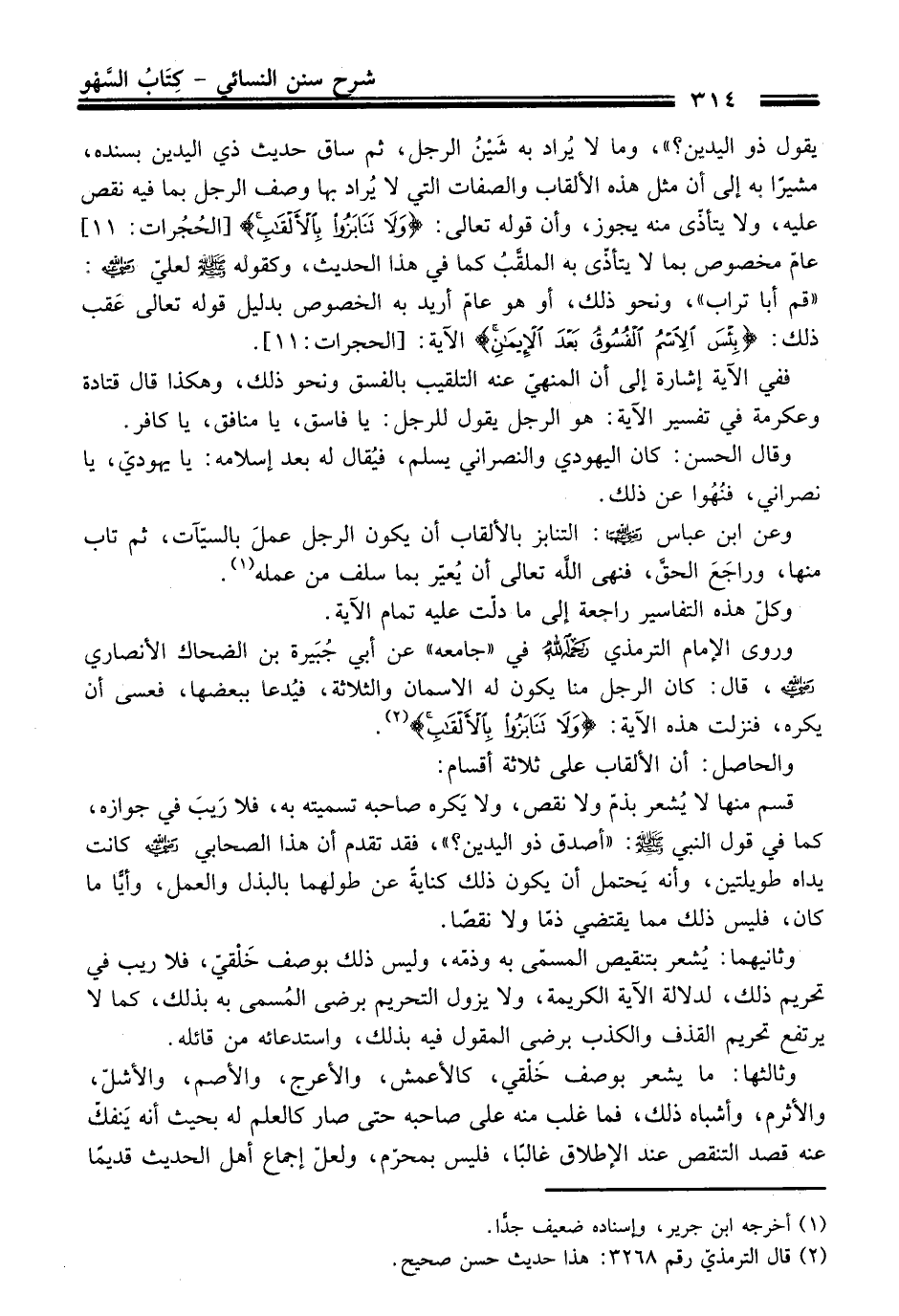 قسم منها لا يُشعر بذمّ ولا نقص، ولا يَكره صاحبه تسميته به، فلا رَيبَ في جوازه، كما في قول النبي - صلى الله عليه وسلم -: "أصدق ذو اليدين؟ "، فقد تقدم أن هذا الصحابي - رضي الله عنه - كانت يداه طويلتين، وأنه يَحتمل أن يكون ذلك كنايةً عن طولهما بالبذل والعمل، وأيًّا ما كان، فليس ذلك مما يقتضي ذمًا ولا نقصًا.