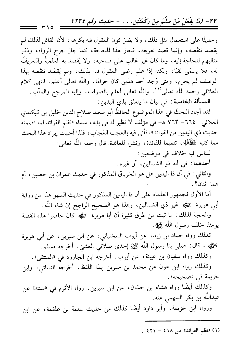 لقد أجاد البحثَ في هذا الموصوع الحافظُ أبو سعيد صلاح الدين خليل بن كيكلدي العلائي -664 - 763 هـ- في مؤلف لا نظير له في بابه، سماه "نظم الفرائد لما تضمنه حديث ذي اليدين من الفوائد"، فأتى فيه بالعجب العُجاب، فلذا أحببت إيراد هذا البحث مما كتبه -رحمه الله-، تتميمًا للفائدة، ونشرا للعائدة. قال رحمه الله تعالى: