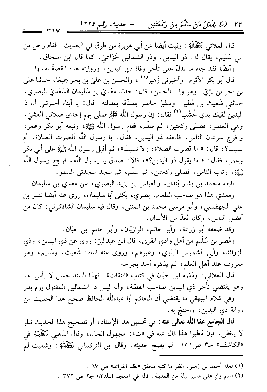 قال العلائي -رحمه الله-: وثبت أيضا عن أبي هريرة من طرق في الحديث: فقام رجل من بني سُليم، يقال له: ذو اليدين. وذو الشمالين خُزَاعيّ، كما قال ابن إسحاق.