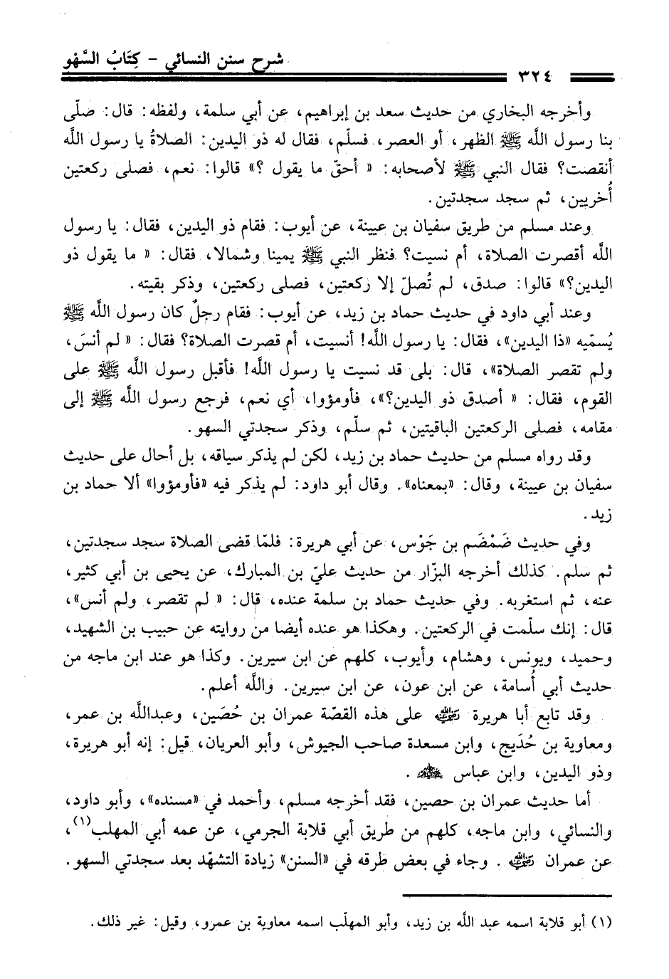 أما حديث عمران بن حصين، فقد أخرجه مسلم، وأحمد في "مسنده"، وأبو داود، والنسائي، وابن ماجه، كلهم من طريق أبي قلابة الجرمي، عن عمه أبي المهلب (¬1)، عن عمران - رضي الله عنه -. وجاء في بعض طرقه في "السنن" زيادة التشهّد بعد سجدتي السهو.