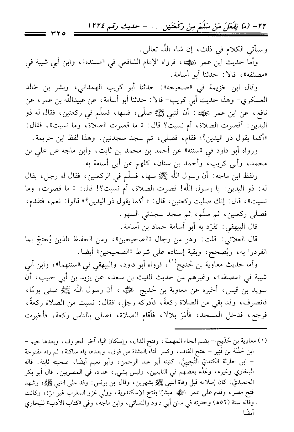وقال ابن خزيمة في "صحيحه": حدثنا أبو كريب الهمداني، وبشر بن خالد العسكري -وهذا حديث أبي كريب- قالا: حدثنا أبو أسامة، عن عبيد الله بن عمر، عن نافع، عن ابن عمر - رضي الله عنهما -: أن النبي - صلى الله عليه وسلم - صلّى، فسها، فسلّم في ركعتين، فقال له ذو اليدين: أقصرت الصلاة، أم نسيت؟ قال: "ما قصرت الصلاة، وما نسيت"، فقال: "أكما يقول ذو اليدين؟ " فقام، فصلى، ثم سجد سجدتين. وهذا لفظ ابن خزيمة.