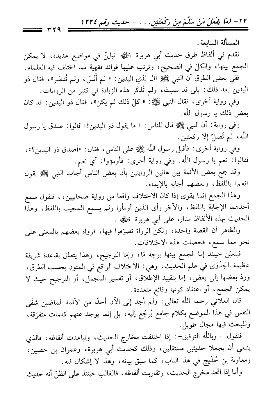 تقدم في ألفاظ طرق حديث أبي هريرة - رضي الله عنه - تباينٌ في مواضع عديدة، لا يمكن الجمع بينها، والكلّ في الصحيح، وترتب عليها فوائد فقهية مما اختلف فيه العلماء.