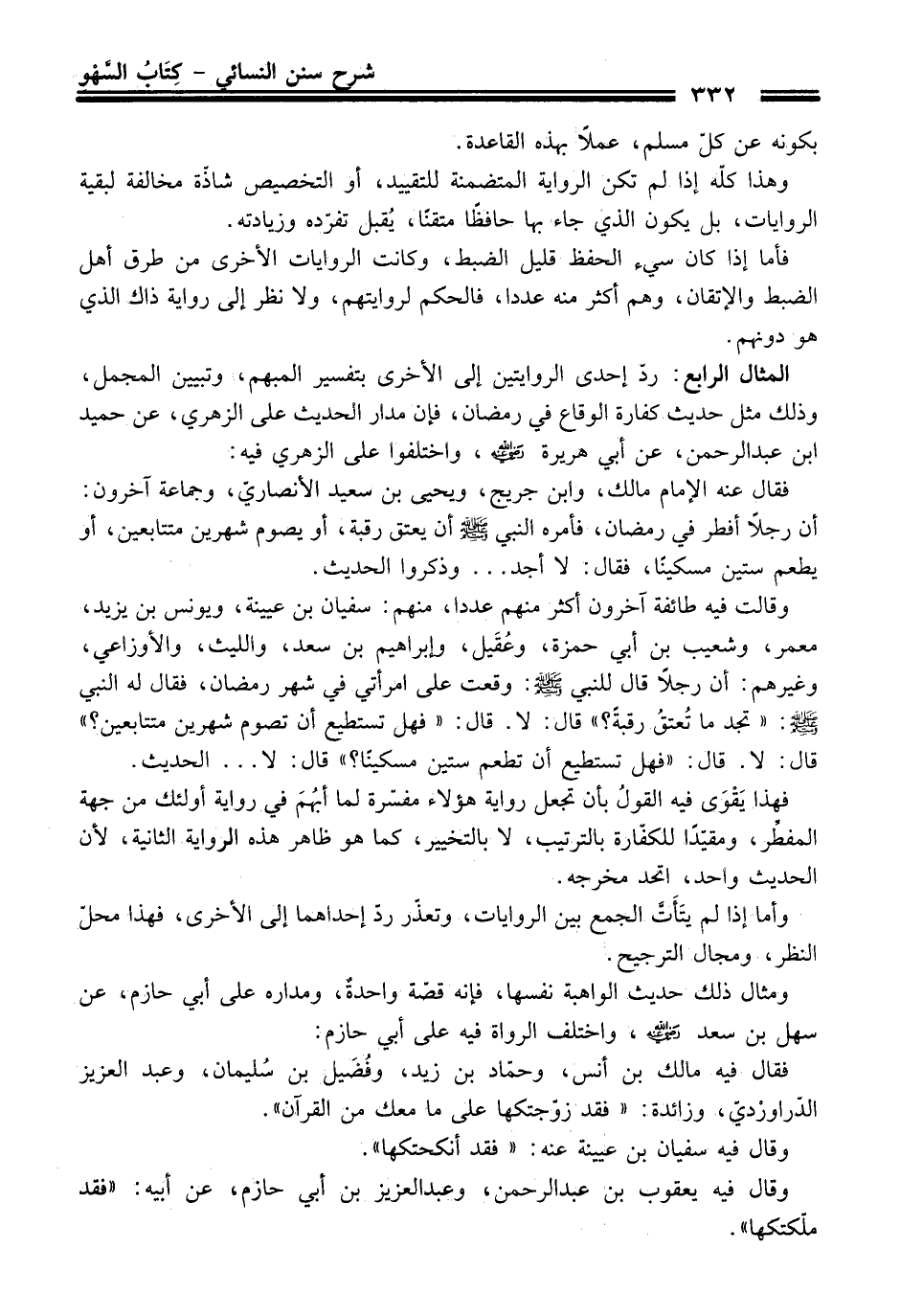 المثال الرابع: ردّ إحدى الروايتين إلى الأخرى بتفسير المبهم، وتبيين المجمل، وذلك مثل حديث كفارة الوقاع في رمضان، فإن مدار الحديث على الزهري، عن حميد ابن عبد الرحمن، عن أبي هريرة - رضي الله عنه -، واختلفوا على الزهري فيه: