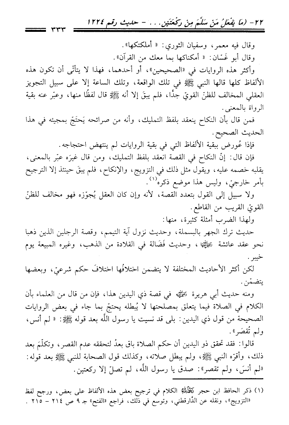 ومنه حديث أبي هريرة - رضي الله عنه - في قصة ذي اليدين هذا، فإن من قال من العلماء بأن الكلام في الصلاة فيما يتعلق بمصلحتها لا يُبطله يحتجّ بما جاء في بعض الروايات الصحيحة من قول ذي اليدين: بلى قد نسيت يا رسول الله بعد قوله - صلى الله عليه وسلم -: "لم أنس، ولم تُقصَر".