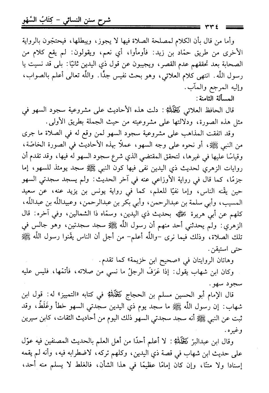 وأما من قال بأن الكلام لمصلحة الصلاة فيها لا يجوز، ويبطلها، فيحتجّون بالرواية الأخرى من طريق حمّاد بن زيد: فأومأوا، أي نعم، ويقولون: لم يقع كلام من الصحابة بعد تحققهم عدم القصر، ويجيبون عن قول ذي اليدين ثانيًا: بلى قد نسيت يا رسول الله. انتهى كلام العلائي، وهو بحث نفيس جدًّا. والله تعالى أعلم بالصواب، وإليه المرجع والمآب.