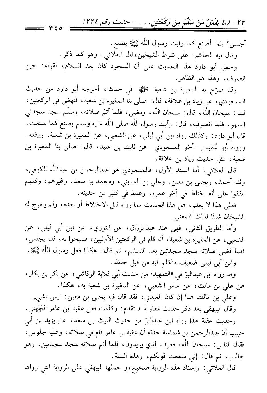 وحديث عقبة هذا رواه ابن عبد البرّ من حديث الليث بن سعد، عن يزيد بن أبي حبيب أن عبد الرحمن بن شماسة حدثه أن عقبة بن عامر قام في صلاته، وعليه جلوس، فقال الناس: سبحان الله، فعرف الذي يريدون، فلما أتم صلاته سجد سجدتين، وهو جالس، ثم قال إني سمعت قولكم، وهذه السنة.