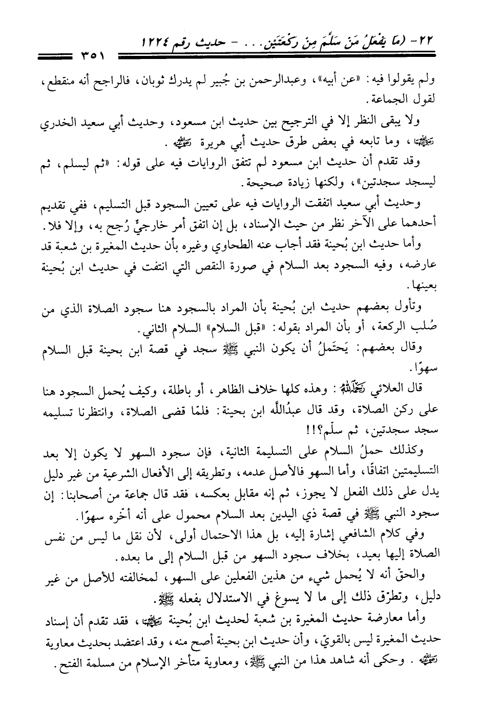 قال العلائي -رحمه الله-: وهذه كلها خلاف الظاهر، أو باطلة، وكيف يُحمل السجود هنا على ركن الصلاة، وقد قال عبدُ الله ابن بحينة: فلمّا قضى الصلاة، وانتظرنا تسليمه سجد سجدتين، ثم سلّم؟!!