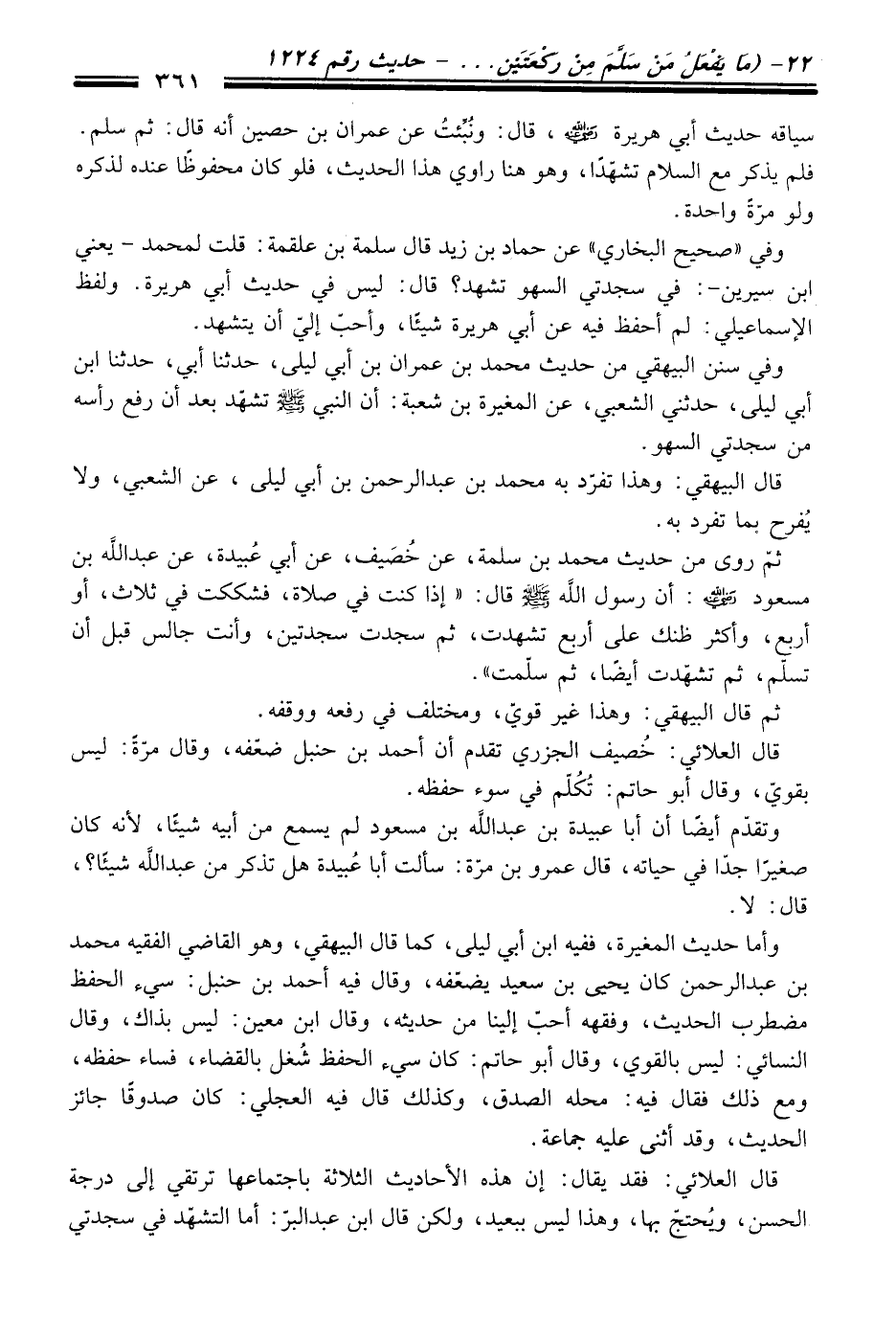 وفي سنن البيهقي من حديث محمد بن عمران بن أبي ليلى، حدثنا أبي، حدثنا ابن أبي ليلى، حدثني الشعبي، عن المغيرة بن شعبة: أن النبي - صلى الله عليه وسلم - تشهّد بعد أن رفع رأسه من سجدتي السهو.