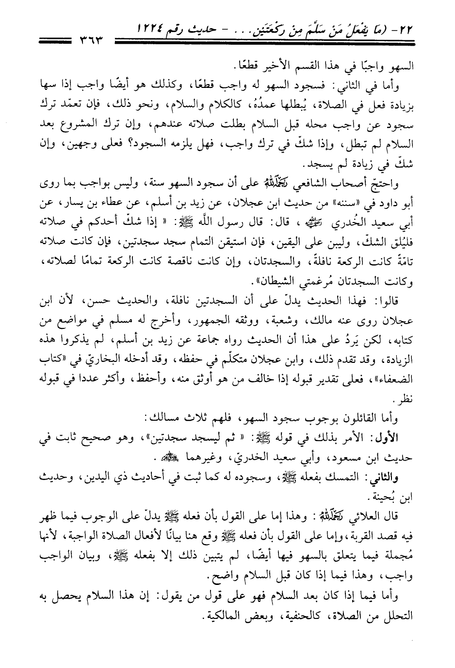 واحتجّ أصحاب الشافعي -رحمه الله- على أن سجود السهو سنة، وليس بواجب بما روى أبو داود في "سننه" من حديث ابن عجلان، عن زيد بن أسلم، عن عطاء بن يسار، عن أبي سعيد الخُدري - رضي الله عنه -، قال: قال رسول الله - صلى الله عليه وسلم -: "إذا شكّ أحدكم في صلاته فليُلق الشكّ، وليبن على اليقين، فإن استيقن التمام سجد سجدتين, فإن كانت صلاته تامّةً كانت الركعة نافلة، والسجدتان، وإن كانت ناقصة كانت الركعة تمامًا لصلاته، وكانت السجدتان مُرغمتي الشيطان".