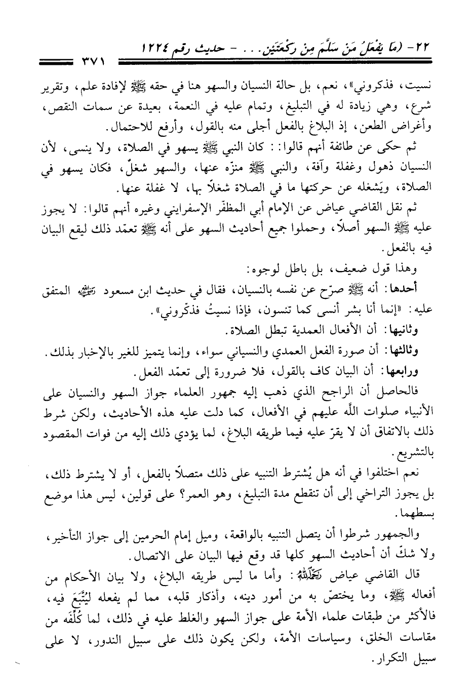 ثم نقل القاضي عياض عن الإمام أبي المظفّر الإسفرايني وغيره أنهم قالوا: لا يجوز عليه - صلى الله عليه وسلم - السهو أصلًا، وحملوا جميع أحاديث السهو على أنه - صلى الله عليه وسلم - تعمّد ذلك ليقع البيان فيه بالفعل.