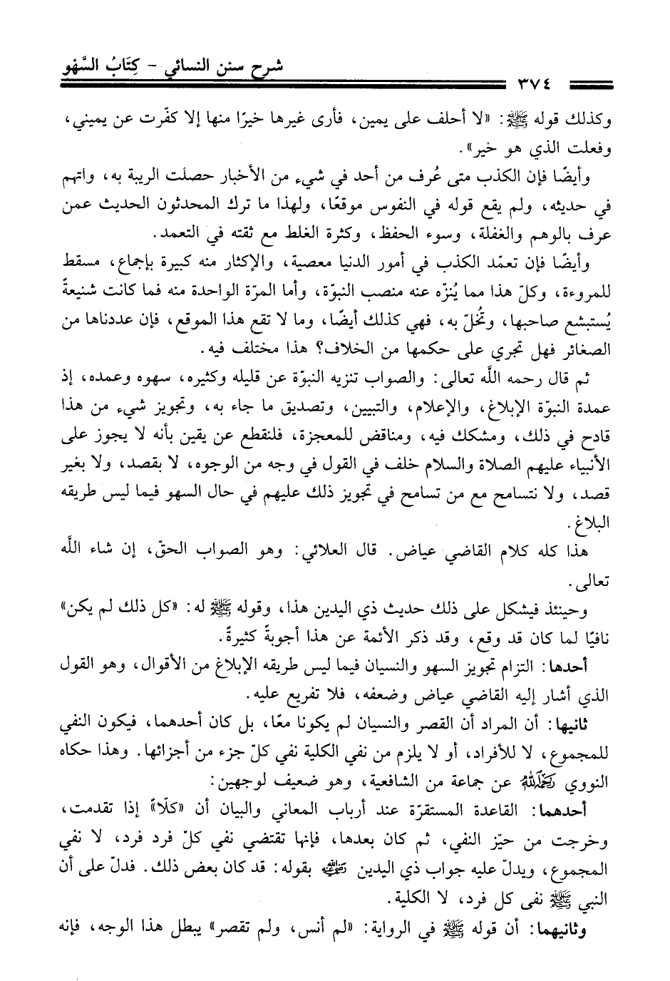 ثم قال رحمه الله تعالى: والصواب تنزيه النبوّة عن قليله وكثيره، سهوه وعمده، إذ عمدة النبوّة الإبلاغ، والإعلام، والتبيين، وتصديق ما جاء به، وتجويز شيء من هذا قادح في ذلك، ومشكك فيه، ومناقض للمعجزة, فلنقطع عن يقين بأنه لا يجوز على الأنبياء عليهم الصلاة والسلام خلف في القول في وجه من الوجوه، لا بقصد، ولا بغير قصد، ولا نتسامح مع من تسامح في تجويز ذلك عليهم في حال السهو فيما ليس طريقه البلاغ.
