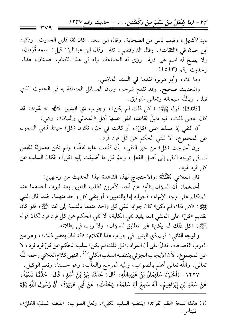 أحدهما: أن السؤال بـ"أم" عن أحد الأمرين لطلب التعيين بعد ثبوت أحدهما عند المتكلم على وجه الإبهام، فجوابه إما بالتعيين، أو بنفي كل واحد منهما، فلما قال النبي - صلى الله عليه وسلم -: "كل ذلك لم يكن" كان جوابه لنفي كل واحد منهما بالنسبة إلى ظنه - صلى الله عليه وسلم -، فلو كان تقديم "كلّ" على المنفي إنما يفيد نفي الكلية، لا نفي الحكم عن كل فرد فرد لكان قوله - صلى الله عليه وسلم -: "كل ذلك لم يكن" غير مطابق للسؤال، ولا ريب في بطلانه.