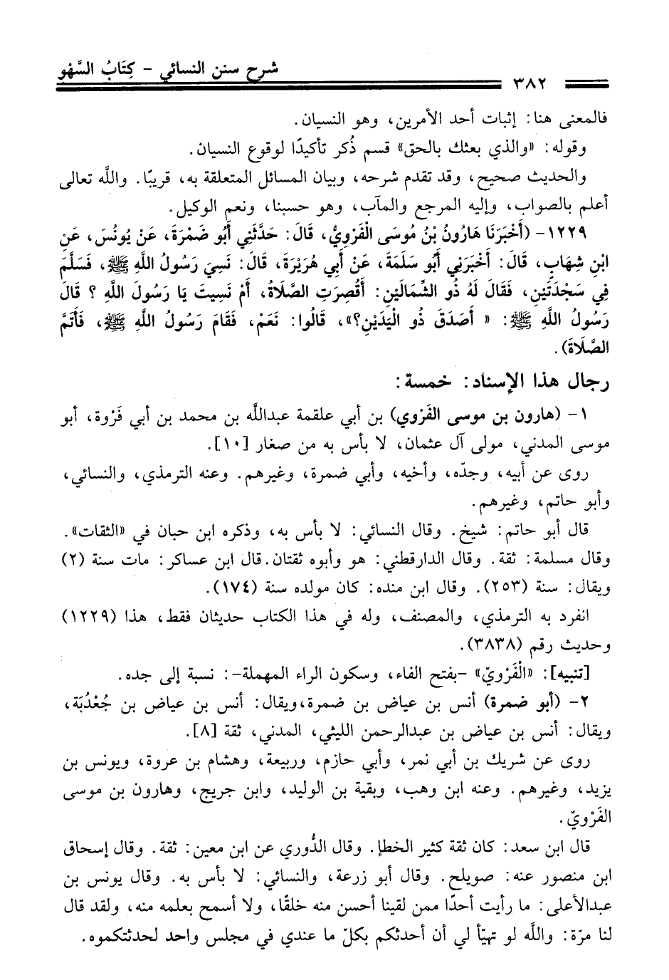 1229 - (أَخْبَرَنَا هَارُونُ بْنُ مُوسَى الْفَرْوِيُّ، قَالَ: حَدَّثَنِي أَبُو ضَمْرَةَ، عَنْ يُونُسَ، عَنِ ابْنِ شِهَابٍ، قَالَ: أَخْبَرَنِي أَبُو سَلَمَةَ، عَنْ أَبِي هُرَيْرَةَ، قَالَ: نَسِيَ رَسُولُ اللَّهِ - صلى الله عليه وسلم -، فَسَلَّمَ فِي سَجْدَتَيْنِ، فَقَالَ لَهُ ذُو الشِّمَالَيْنِ: أَقُصِرَتِ الصَّلاَةُ، أَمْ نَسِيتَ يَا رَسُولَ اللَّهِ؟ قَالَ رَسُولُ اللَّهِ - صلى الله عليه وسلم -: "أَصَدَقَ ذُو الْيَدَيْنِ؟ "، قَالُوا: نَعَمْ، فَقَامَ رَسُولُ اللَّهِ - صلى الله عليه وسلم - فَأَتَمَّ الصَّلاَةَ).