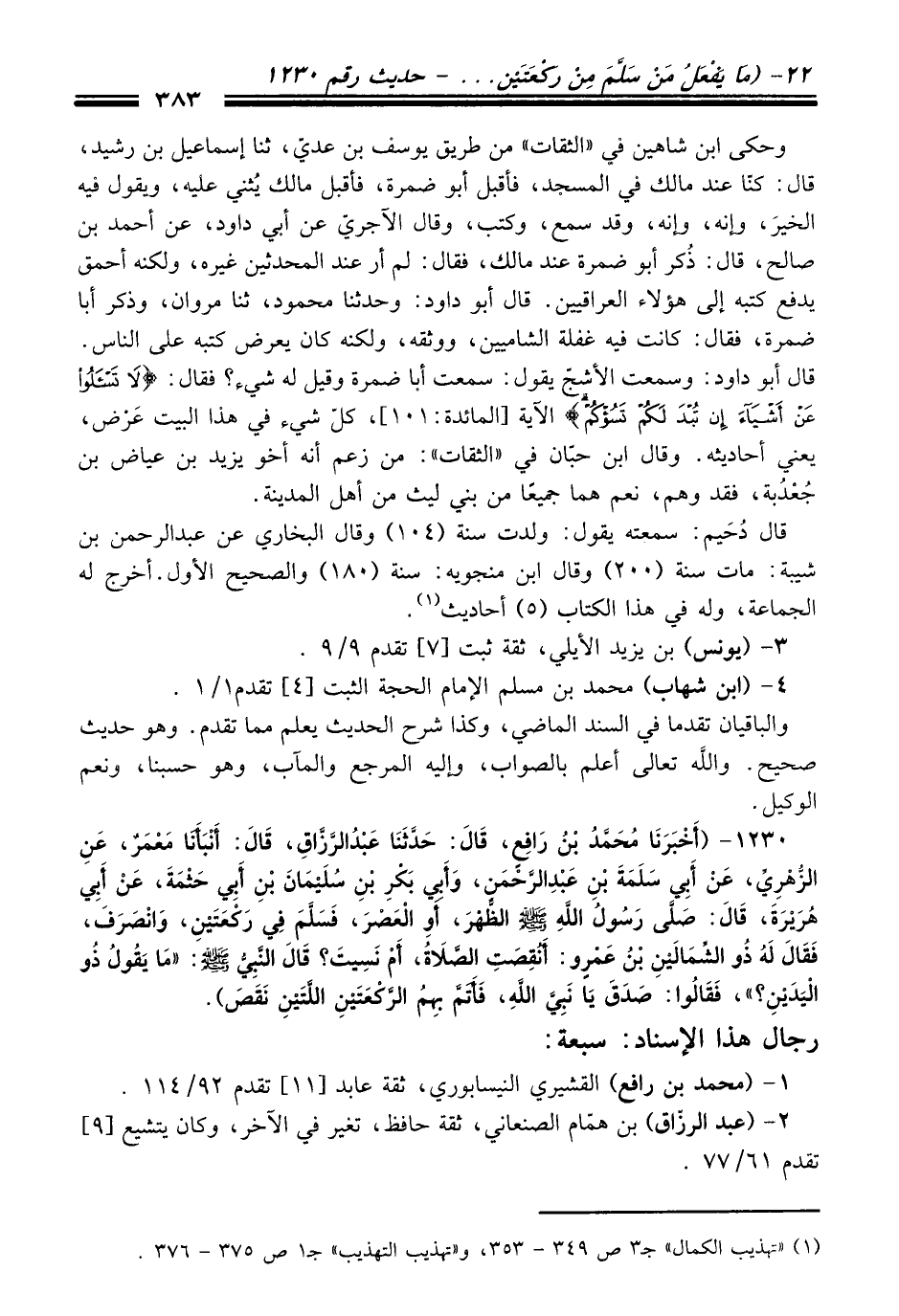 1230 - (أَخْبَرَنَا مُحَمَّدُ بْنُ رَافِعٍ، قَالَ: حَدَّثَنَا عَبْدُ الرَّزَّاقِ، قَالَ: أَنْبَأَنَا مَعْمَرٌ، عَنِ الزُّهْرِيِّ، عَنْ أَبِي سَلَمَةَ بْنِ عَبْدِ الرَّحْمَنِ، وَأَبِي بَكْرِ بْنِ سُلَيْمَانَ بْنِ أَبِي حَثْمَةَ، عَنْ أَبِي هُرَيْرَةَ، قَالَ: صَلَّى رَسُولُ اللَّهِ - صلى الله عليه وسلم - الظُّهْرَ، أَوِ الْعَصْرَ، فَسَلَّمَ فِي رَكْعَتَيْنِ، وَانْصَرَفَ، فَقَالَ لَهُ ذُو الشِّمَالَيْنِ بْنُ عَمْرٍو: أَنُقِصَتِ الصَّلاَةُ، أَمْ نَسِيتَ؟ فَقَالَ النَّبِيُّ - صلى الله عليه وسلم -: "مَا يَقُولُ ذُو الْيَدَيْنِ؟ "، فَقَالُوا: صَدَقَ يَا نَبِيَّ اللَّهِ، فَأَتَمَّ بِهِمُ الرَّكْعَتَيْنِ اللَّتَيْنِ نَقَصَ).