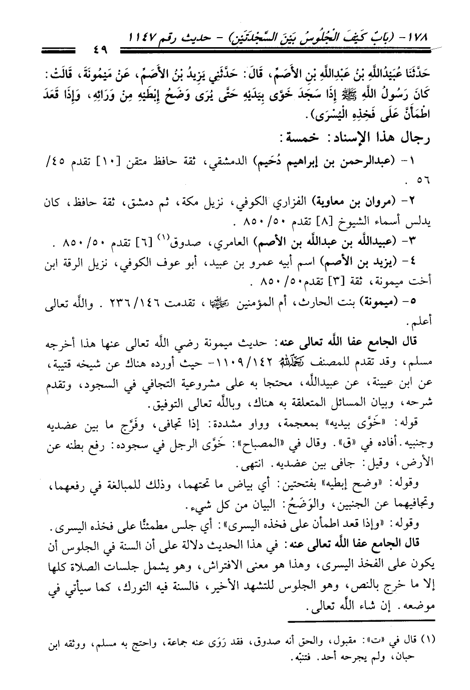 قال الجامع عفا الله تعالى عنه: حديث ميمونة رضي الله تعالى عنها هذا أخرجه مسلم، وقد تقدم للمصنف -رحمه الله-142/ 1109 - حيث أورده هناك عن شيخه قتيبة، عن ابن عيينة، عن عبيد الله، محتجا به على مشروعية التجافي في السجود، وتقدم شرحه، وبيان المسائل المتعلقة به هناك، وبالله تعالى التوفيق.