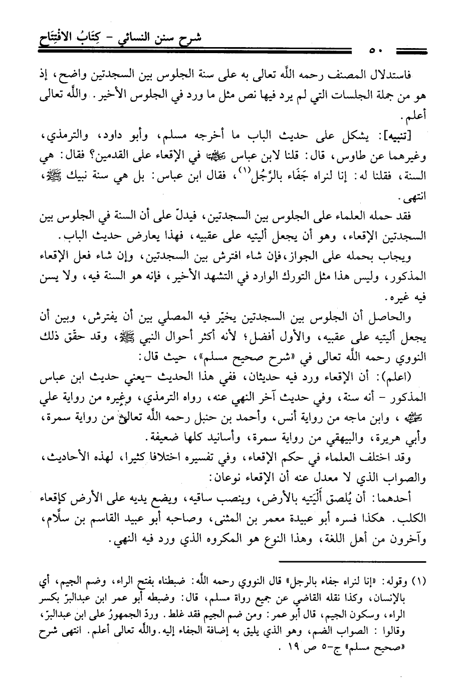 والحاصل أن الجلوس بين السجدتين يخيّر فيه المصلي بين أن يفترش، وبين أن يجعل أليتيه على عقبيه، والأول أفضل؛ لأنه أكثر أحوال النبي - صلى الله عليه وسلم -، وقد حقّق ذلك النووي رحمه الله تعالى في "شرح صحيح مسلم"، حيث قال: