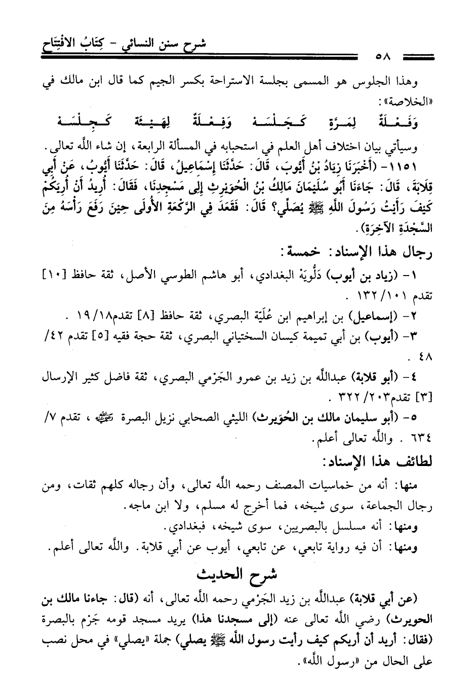 1151 - (أَخْبَرَنَا زِيَادُ بْنُ أَيُّوبَ، قَالَ: حَدَّثَنَا إِسْمَاعِيلُ، قَالَ: حَدَّثَنَا أَيُّوبُ، عَنْ أَبِي قِلاَبَةَ، قَالَ: جَاءَنَا أَبُو سُلَيْمَانَ مَالِكُ بْنُ الْحُوَيْرِثِ إِلَى مَسْجِدِنَا، فَقَالَ: أُرِيدُ أَنْ أُرِيَكُمْ كَيْفَ رَأَيْتُ رَسُولَ اللَّهِ - صلى الله عليه وسلم - يُصَلِّي؟ قَالَ: فَقَعَدَ فِي الرَّكْعَةِ الأُولَى حِينَ رَفَعَ رَأْسَهُ مِنَ السَّجْدَةِ الآخِرَةِ).