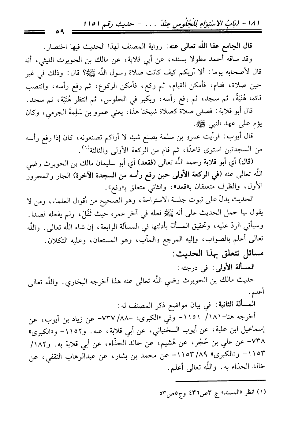 وقد ساقه أحمد مطولا بسنده، عن أبي قلابة، عن مالك بن الحويرث الليثي، أنه قال لأصحابه يوما: ألا أريكم كيف كانت صلاة رسول الله - صلى الله عليه وسلم -؟ قال: وذلك في غير حين صلاة، فقام، فأمكن القيام، ثم ركع، فأمكن الركوع، ثم رفع رأسه، وانتصب قائما هُنَيًّة، ثم سجد، ثم رفع رأسه، ويكبر في الجلوس، ثم انتظر هُنَيّة، ثم سجد.
