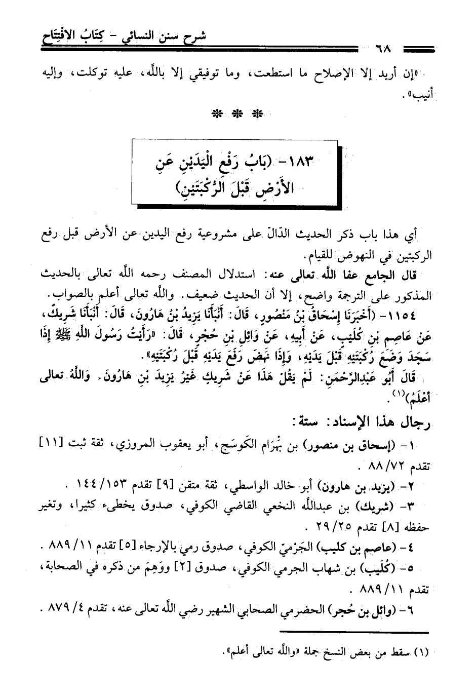 1154 - (أَخْبَرَنَا إِسْحَاقُ بْنُ مَنْصُورٍ، قَالَ: أَنْبَأَنَا يَزِيدُ بْنُ هَارُونَ، قَالَ: أَنْبَأَنَا شَرِيكٌ، عَنْ عَاصِمِ بْنِ كُلَيْبٍ، عَنْ أَبِيهِ، عَنْ وَائِلِ بْنِ حُجْرٍ، قَالَ: "رَأَيْتُ رَسُولَ اللَّهِ - صلى الله عليه وسلم - إِذَا سَجَدَ وَضَعَ رُكْبَتَيْهِ قَبْلَ يَدَيْهِ، وَإِذَا نَهَضَ رَفَعَ يَدَيْهِ قَبْلَ رُكْبَتَيْهِ". قَالَ أَبُو عَبْدِ الرَّحْمَنِ: لَمْ يَقُلْ هَذَا عَنْ شَرِيكٍ غَيْرُ يَزِيدَ بْنِ هَارُونَ وَاللَّهُ تَعَالَى أَعْلَمُ) (¬1).