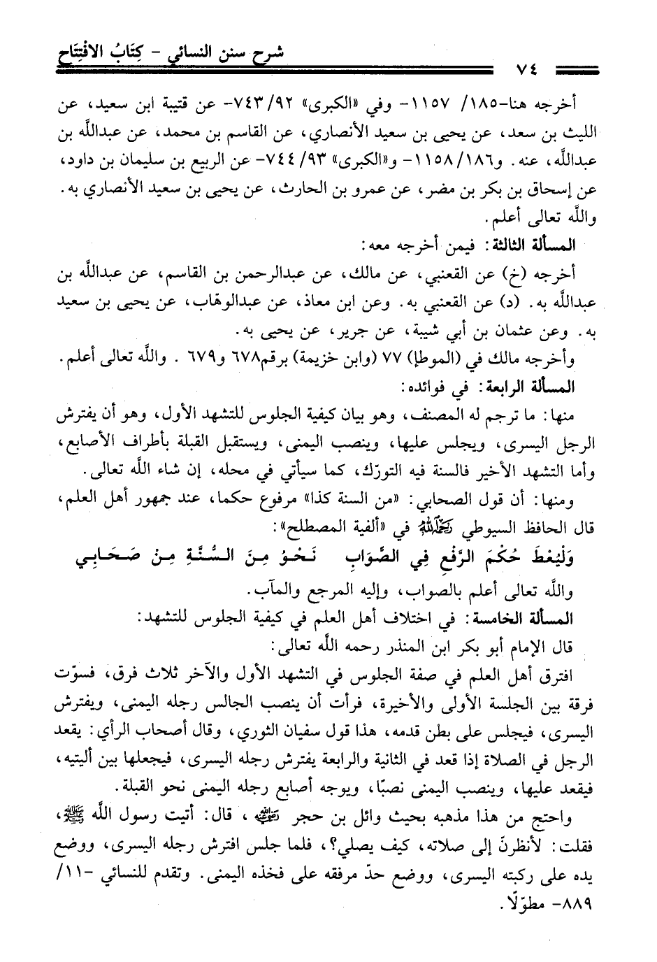 واحتج من هذا مذهبه بحيث وائل بن حجر - رضي الله عنه -، قال: أتيت رسول الله - صلى الله عليه وسلم -، فقلت: لأنظرنّ إلى صلاته، كيف يصلي؟، فلما جلس افترش رجله اليسرى، ووضع يده على ركبته اليسرى، ووضع حدّ مرفقه على فخذه اليمنى. وتقدم للنسائي -11/ 889 - مطوّلًا.