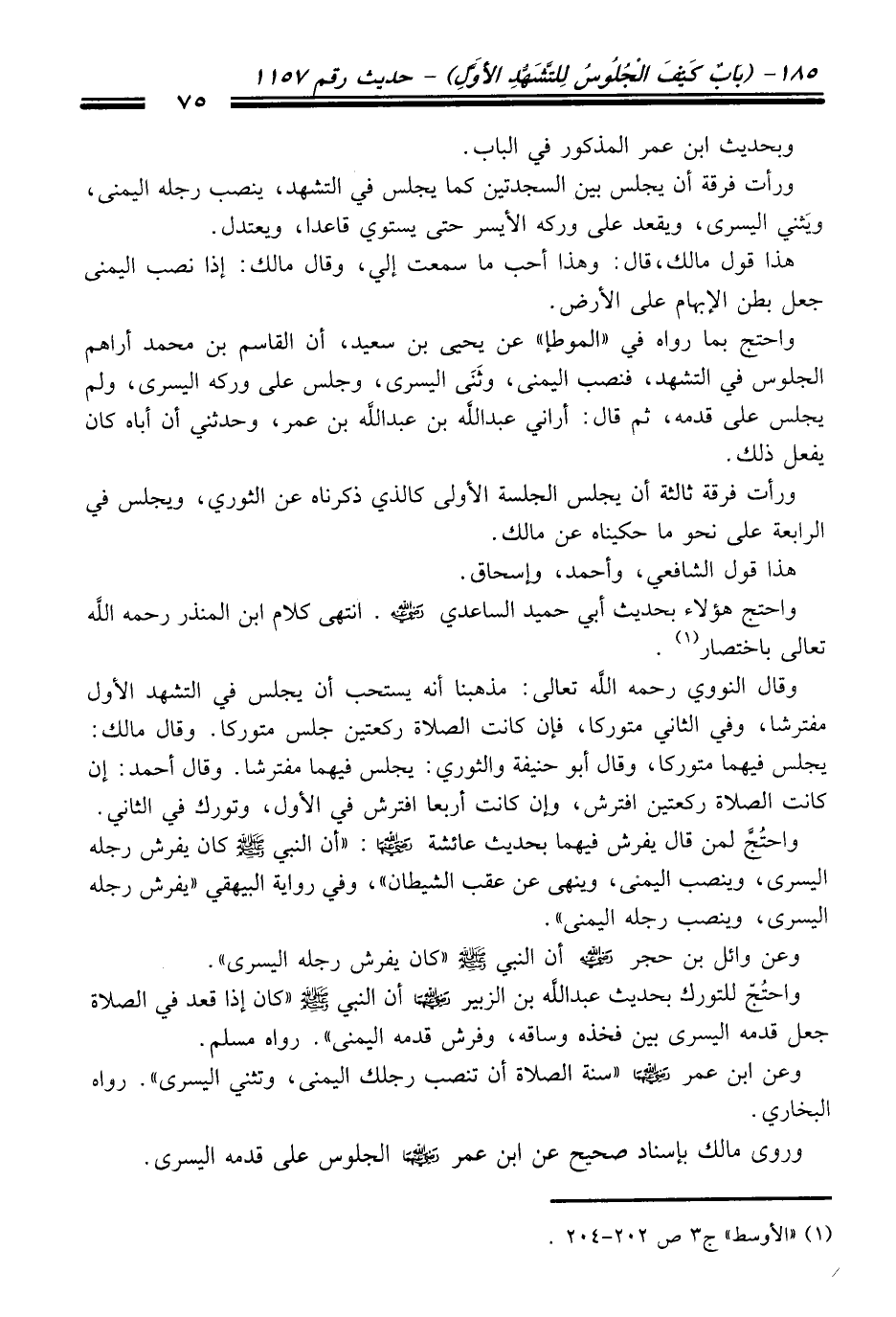 وروى مالك بإسناد صحيح عن ابن عمر - رضي الله عنهما - الجلوس على قدمه اليسرى.