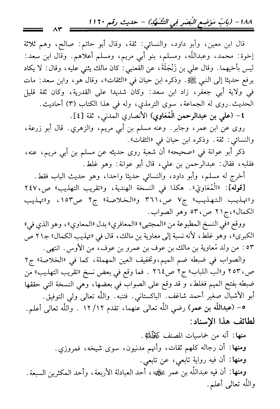 والصواب في ضبطه ضم الميم، وتخفيف العين المهملة، كما في "الخلاصة" ج 2 ص 253 و"لب اللباب" ج 2 ص 264. فما وقع في بعض نسخ "تقريب التهذيب" من ضبطه بفتح الميم فغلط، وقد وقع على الصواب في بعضها، وهي النسخة التي حققها أبو الأشبال صغير أحمد شاغف. الباكستاني. فتنبه. والله تعالى ولي التوفيق.