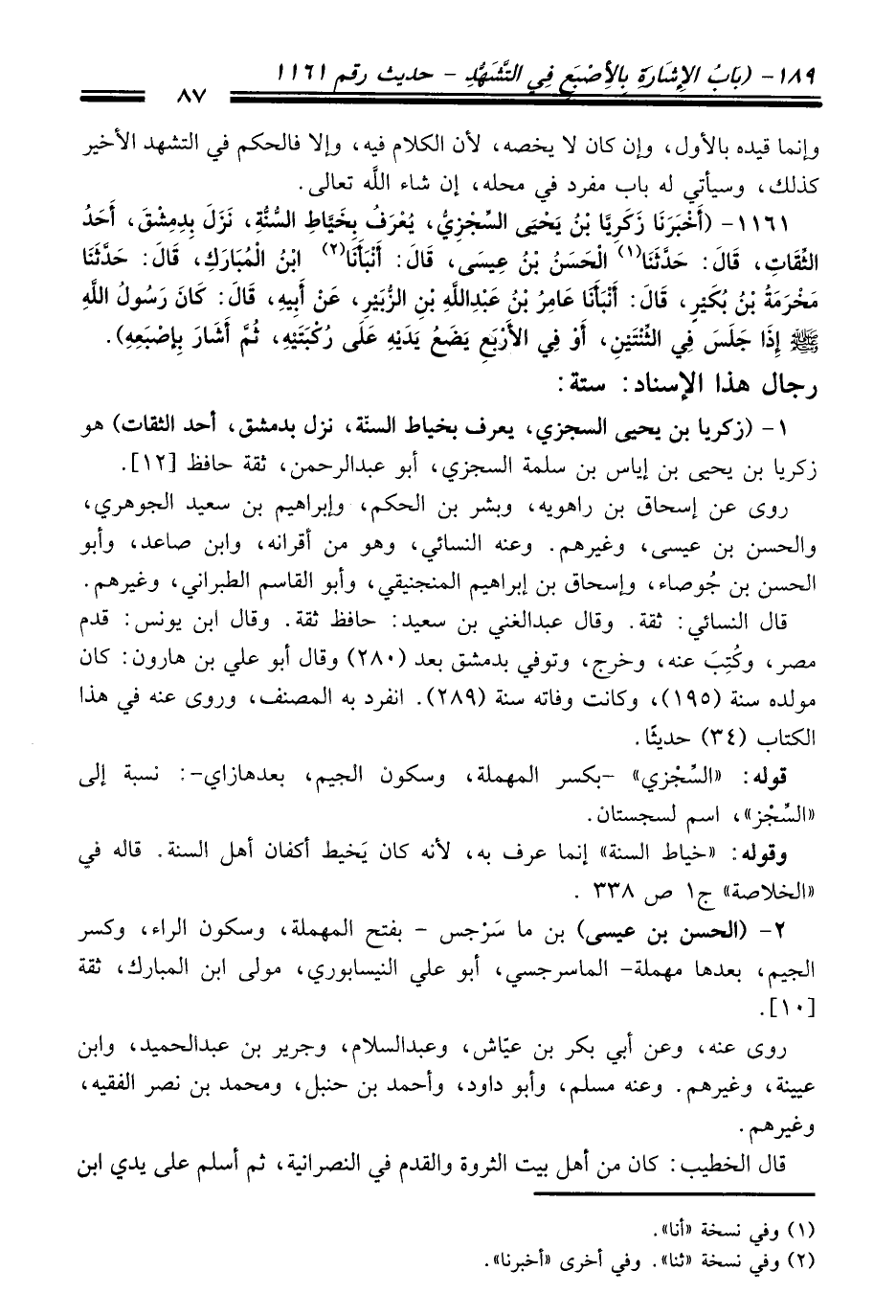 1161 - (أَخْبَرَنَا زَكَرِيَّا بْنُ يَحْيَى السِّجْزِيُّ، يُعْرَفُ بِخَيَّاطِ السُّنَّةِ، نَزَلَ بِدِمَشْقَ، أَحَدُ الثِّقَاتِ، قَالَ: حَدَّثَنَا (¬1) الْحَسَنُ بْنُ عِيسَى، قَالَ: أَنْبَأَنَا (¬2) ابْنُ الْمُبَارَكِ، قَالَ: حَدَّثَنَا مَخْرَمَةُ بْنُ بُكَيْرٍ، قَالَ: أَنْبَأَنَا عَامِرُ بْنُ عَبْدِ اللَّهِ بْنِ الزُّبَيْرِ، عَنْ أَبِيهِ، قَالَ: كَانَ رَسُولُ اللَّهِ -صلى الله عليه وسلم - إِذَا جَلَسَ فِي الثِّنْتَيْنِ، أَوْ فِي الأَرْبَعِ يَضَعُ يَدَيْهِ عَلَى رُكْبَتَيْهِ، ثُمَّ أَشَارَ بِأُصْبُعِهِ).