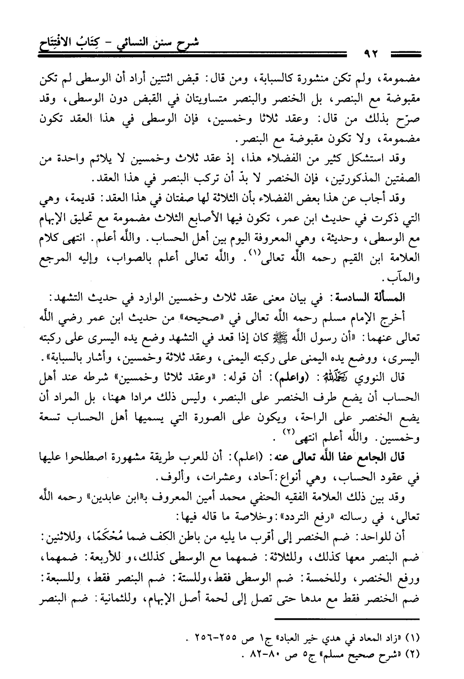 وقد أجاب عن هذا بعض الفضلاء بأن الثلاثة لها صفتان في هذا العقد: قديمة، وهي التي ذكرت في حديث ابن عمر، تكون فيها الأصابع الثلاث مضمومة مع تحليق الإبهام مع الوسطى، وحديثة، وهي المعروفة اليوم بين أهل الحساب. والله أعلم. انتهى كلام العلامة ابن القيم رحمه الله تعالى (¬1). والله تعالى أعلم بالصواب، وإليه المرجع والمآب.