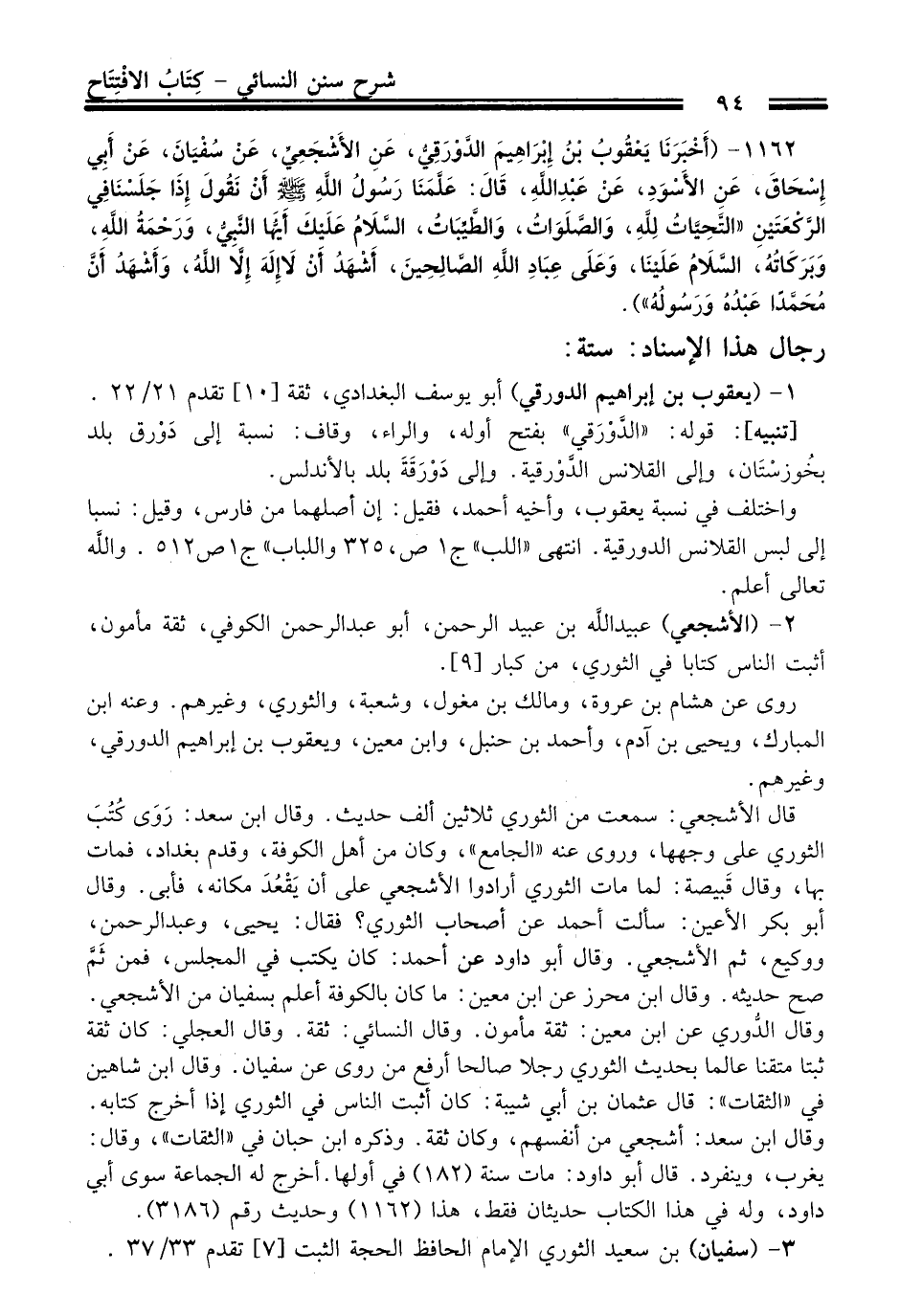 1162 - (أَخْبَرَنَا يَعْقُوبُ بْنُ إِبْرَاهِيمَ الدَّوْرَقِيُّ، عَنِ الأَشْجَعِيِّ، عَنْ سُفْيَانَ، عَنْ أَبِي إِسْحَاقَ، عَنِ الأَسْوَدِ، عَنْ عَبْدِ اللَّهِ، قَالَ: عَلَّمَنَا رَسُولُ اللَّهِ - صلى الله عليه وسلم - أَنْ نَقُولَ إِذَا جَلَسْنَا فِي الرَّكْعَتَيْنِ: "التَّحِيَّاتُ لِلَّهِ، وَالصَّلَوَاتُ، وَالطَّيِّبَاتُ، السَّلاَمُ عَلَيْكَ أَيُّهَا النَّبِيُّ، وَرَحْمَةُ اللَّهِ، وَبَرَكَاتُهُ، السَّلاَمُ عَلَيْنَا، وَعَلَى عِبَادِ اللَّهِ الصَّالِحِينَ، أَشْهَدُ أَنْ لاَ إِلَهَ إِلاَّ اللَّهُ، وَأَشْهَدُ أَنَّ مُحَمَّدًا عَبْدُهُ وَرَسُولُهُ").