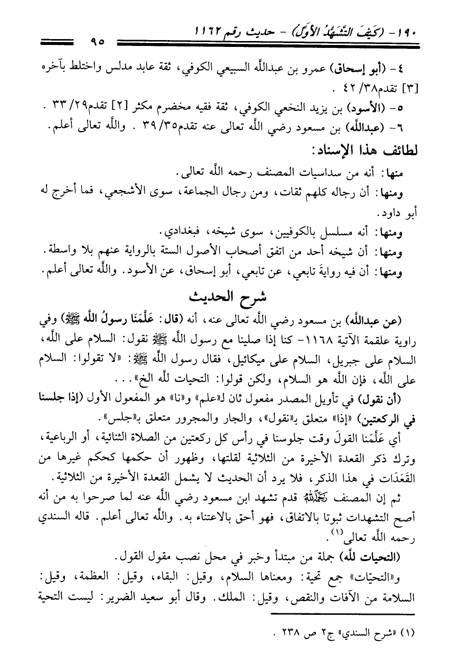 (عن عبد الله) بن مسعود رضي الله تعالى عنه، أنه (قال: عَلَّمَنَا رسولُ الله - صلى الله عليه وسلم -) وفي راوية علقمة الآتية 1168 - كنا إذا صلينا مع رسول الله - صلى الله عليه وسلم - نقول: السلام على الله، السلام على جبريل، السلام على ميكائيل، فقال رسول الله - صلى الله عليه وسلم -: "لا تقولوا: السلام على الله، فإن الله هو السلام، ولكن قولوا: التحيات لله الخ". . .