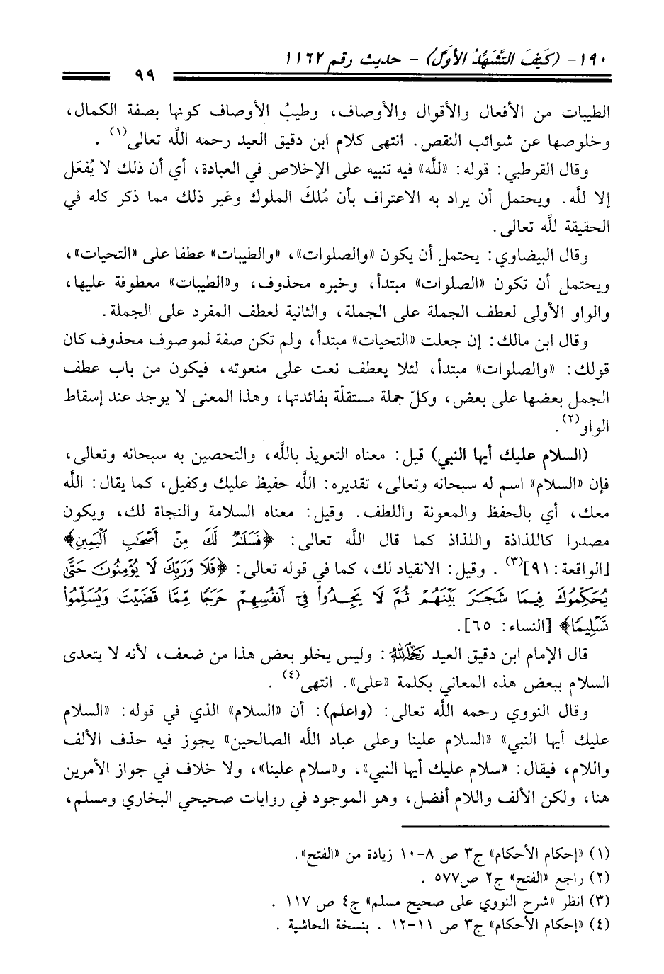 قال الإمام ابن دقيق العيد -رحمه الله-: وليس يخلو بعض هذا من ضعف؛ لأنه لا يتعدى السلام ببعض هذه المعاني بكلمة "على". انتهى (¬4).