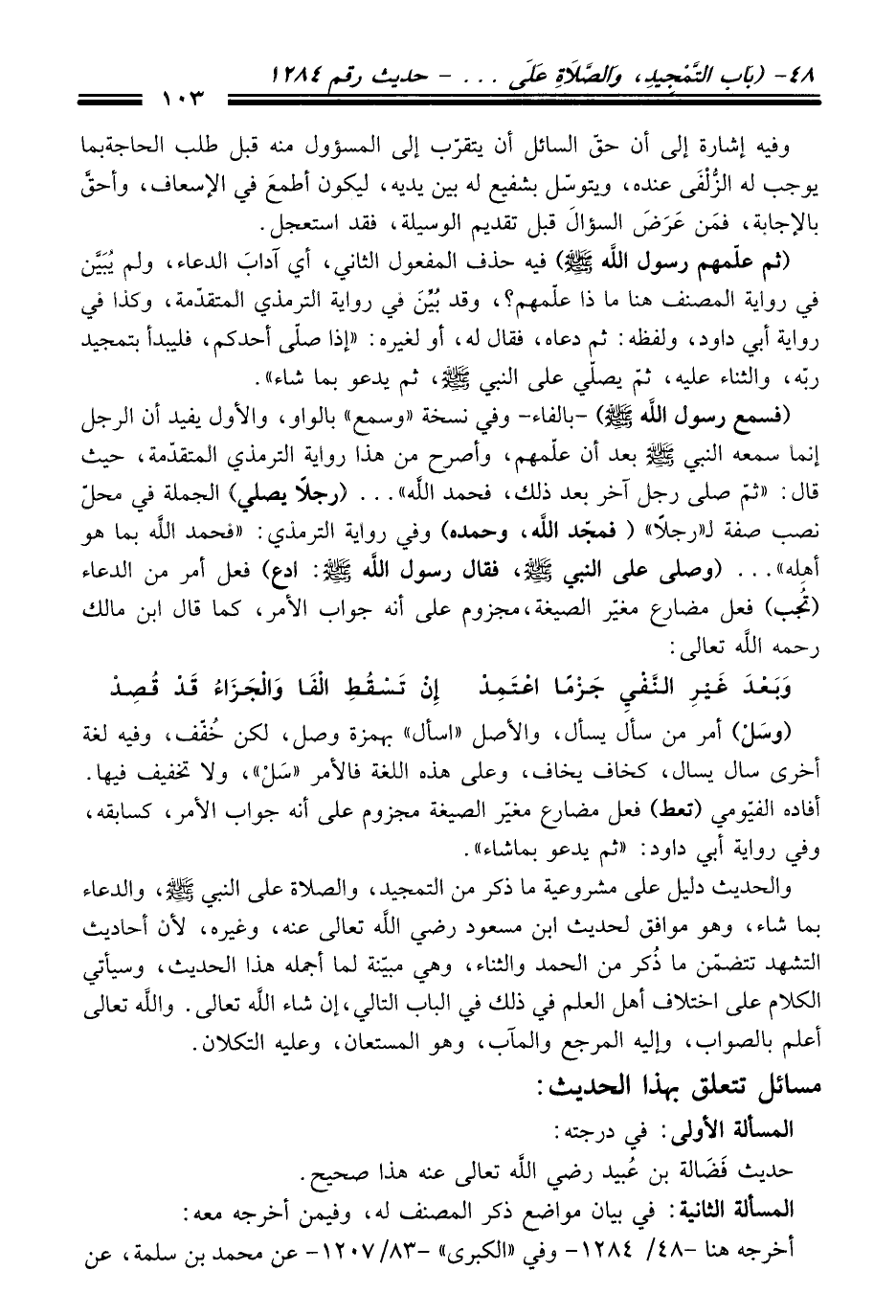 (فسمع رسول الله -صلى الله عليه وسلم-) -بالفاء- وفي نسخة "وسمع" بالواو، والأول يفيد أن الرجل إنما سمعه النبي -صلى الله عليه وسلم- بعد أن علّمهم، وأصرح من هذا رواية الترمذي المتقدّمة، حيث قال: "ثمّ صلى رجل آخر بعد ذلك، فحمد الله" ... (رجلاً يصلي) الجملة في محلّ نصب صفة لـ"رجلاً" (فمجّد الله، وحمده) وقي رواية الترمذي: "فحمد الله بما هو أهِله" ... (وصلى على النبي -صلى الله عليه وسلم-، فقال رسول الله -صلى الله عليه وسلم-: ادع) فعل أمر من الدعاء (تجب) فعل مضارع مغيّر الصيغة، مجزوم على أنه جواب الأمر، كما قال ابن مالك رحمه الله تعالى: