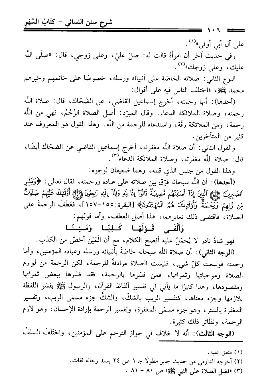(أحدها): أن الله سبحانه فرّق بين صلاته على عباده ورحمته، فقال تعالى: {وَبَشِّرِ الصَّابِرِينَ (155) الَّذِينَ إِذَا أَصَابَتْهُمْ مُصِيبَةٌ قَالُوا إِنَّا لِلَّهِ وَإِنَّا إِلَيْهِ رَاجِعُونَ (156) أُولَئِكَ عَلَيْهِمْ صَلَوَاتٌ مِنْ رَبِّهِمْ وَرَحْمَةٌ وَأُولَئِكَ هُمُ الْمُهْتَدُونَ (157)} [البقرة: 155 - 157]، فعَطَفَ الرحمةَ على الصلاة، فاقتضى ذلك تغايرهما، هذا أصل العطف، وأما قولهم: