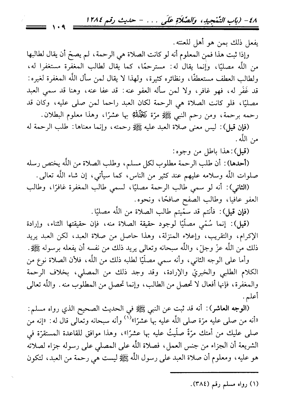 (الوجه العاشر): أنه قد ثبت عن النبي -صلى الله عليه وسلم- في الحديث الصحيح الذي رواه مسلم: "أنه من صلى عليه مرّة صلى الله عليه بها عشراً" (¬1) وأنه سبحانه وتعالى قال له: "إنه من صلى عليك من أمتك مرّة صلّيتُ عليه بها عشراً"، وهذا موافق للقاعدة المستقرّة في الشريعة أن الجزاء من جنس العمل، فصلاة الله على المصلي على رسوله جزاء لصلاته هو عليه، ومعلوم أن صلاة العبد على رسول الله -صلى الله عليه وسلم- ليست هي رحمة من العبد، لتكون
