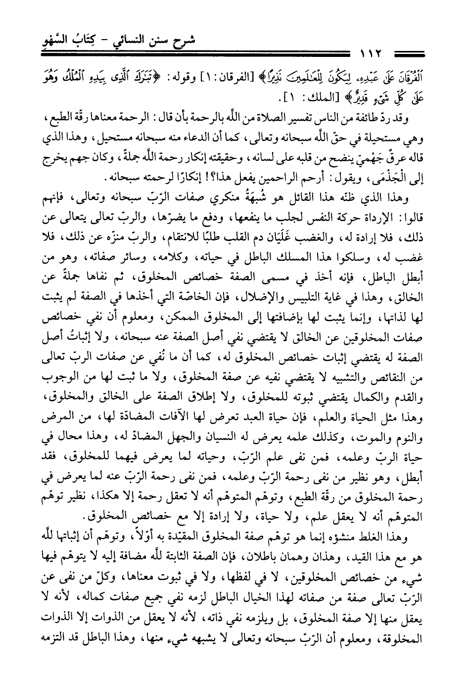 وهذا الذي ظنّه هذا القائل هو شُبهَةُ منكري صفات الرّبّ سبحانه وتعالى، فإنهم قالوا: الإرداة حركة النفس لجلب ما ينفعها، ودفع ما يضرّها، والربّ تعالى يتعالى عن ذلك، فلا إرادة له، والغضب غَلَيَان دم القلب طلباً للانتقام، والربّ منزّه عن ذلك، فلا غضب له، وسلكوا هذا المسلك الباطل في حياته، وكلامه، وسائر صفاته، وهو من أبطل الباطل، فإنه أخذ في مسمى الصفة خصائص المخلوق، ثم نفاها جملةً عن الخالق، وهذا في غاية التلبيس والإضلال، فإن الخاصّة التي أخذها في الصفة لم يثبت لها لذاتها، وإنما يثبت لها بإضافتها إلى المخلوق الممكن، ومعلوم أن نفي خصائص صفات المخلوقين عن الخالق لا يقتضي نفي أصل الصفة عنه سبحانه، ولا إثباتُ أصل الصفة له يقتضي إثبات خصائص المخلوق له، كما أن ما نُفي عن صفات الربّ تعالى من النقائص والتشبيه لا يقتضي نفيه عن صفة المخلوق، ولا ما ثبت لها من الوجوب والقدم والكمال يقتضي ثبوته للمخلوق، ولا إطلاق الصفة على الخالق والمخلوق، وهذا مثل الحياة والعلم، فإن حياة العبد تعرض لها الآفات المضادّة لها، من المرض والنوم والموت، وكذلك علمه يعرض له النسيان والجهل المضادّ له، وهذا محال في حياة الربّ وعلمه، فمن نفى علم الرّبّ، وحياته لما يعرض فيهما للمخلوق، فقد أبطل، وهو نظير من نفى رحمة الرّبّ وعلمه، فمن نفى رحمة الرّبّ عنه لما يعرض في رحمة المخلوق من رقّة الطبع، وتوهّم المتوهّم أنه لا تعقل رحمة إلا هكذا، نظير توهّم المتوهّم أنه لا يعقل علم، ولا حياة، ولا إرادة إلا مع خصائص المخلوق.