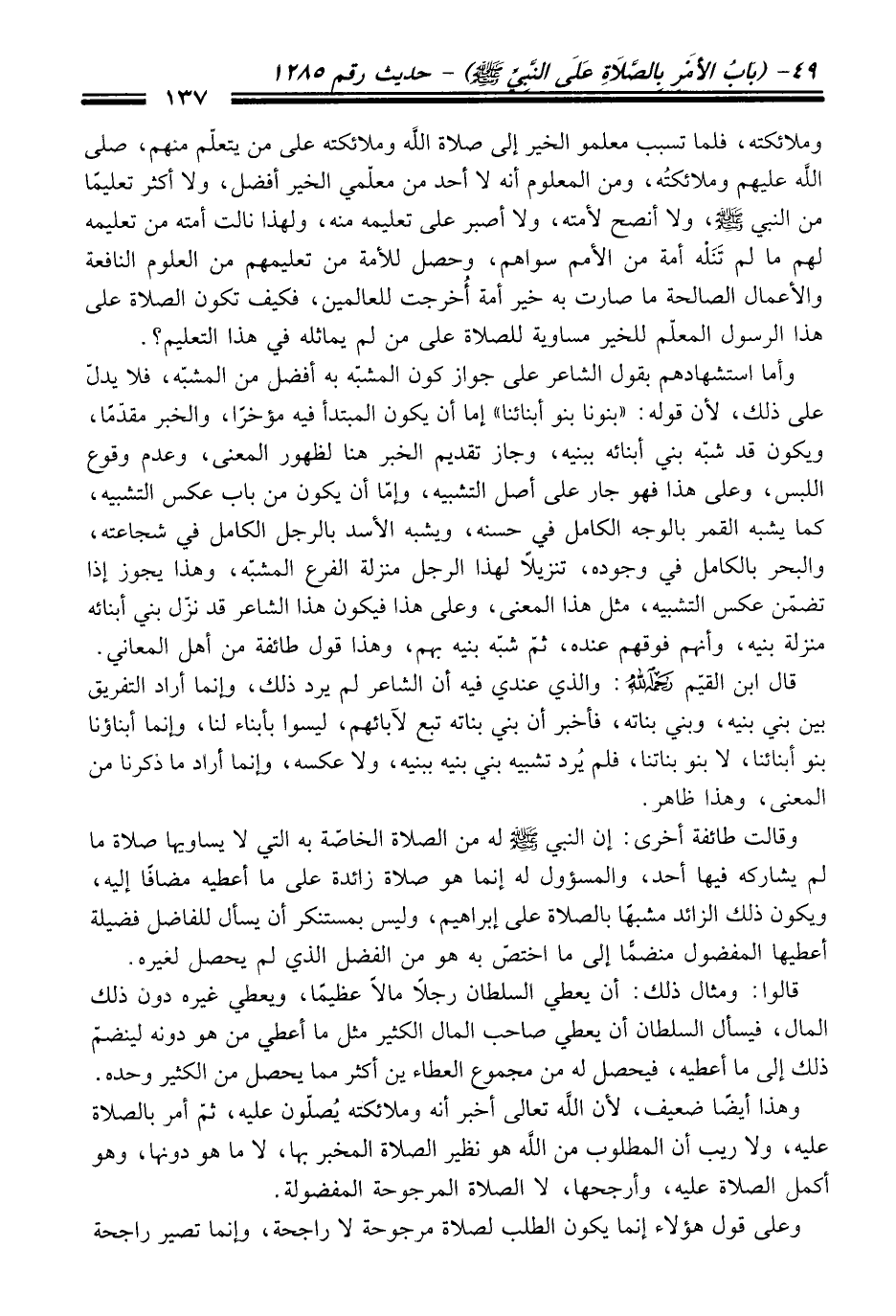 وهذا أيضاً ضدِف، لأن الله تعالى أخبر أنه وملائكته يُصلّون عليه، ثمّ أمر بالصلاة عليه، ولا ريب أن المطلوب من الله هو نظير الصلاة المخبر بها، لا ما هو دونها، وهو أكمل الصلاة عليه، وأرجحها، لا الصلاة المرجوحة المفضولة.