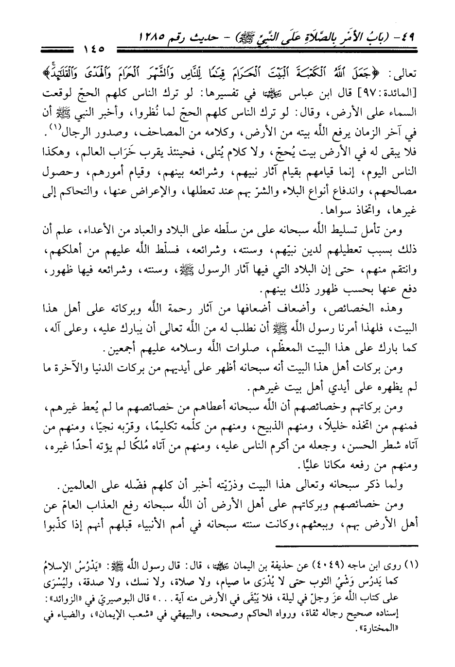 تعالى: {جَعَلَ اللَّهُ الْكَعْبَةَ الْبَيْتَ الْحَرَامَ قِيَامًا لِلنَّاسِ وَالشَّهْرَ الْحَرَامَ وَالْهَدْيَ وَالْقَلَائِدَ} [المائدة: 97] قال ابن عباس -رضي الله عنهما- في تفسيرها: لو ترك الناس كلهم الحجّ لوقعت السماء على الأرض، وقال: لو ترك الناس كلهم الحجّ لما نُظروا، وأخبر النبي -صلى الله عليه وسلم- أن في آخر الزمان يرفع الله بيته من الأرض، وكلامه من المصاحف، وصدور الرجال (¬1). فلا يبقى له في الأرض بيت يُحجّ، ولا كلام يُتلى، فحينئذ يقرب خَرَاب العالم، وهكذا الناس اليوم، إنما قيامهم بقيام آثار نبيهم، وشرائعه بينهم، وقيام أمورهم، وحصول مصالحهم، واندفاع أنواع البلاء والشرّ بهم عند تعطلها، والإعراض عنها، والتحاكم إلى غيرها، واتخاذ سواها.