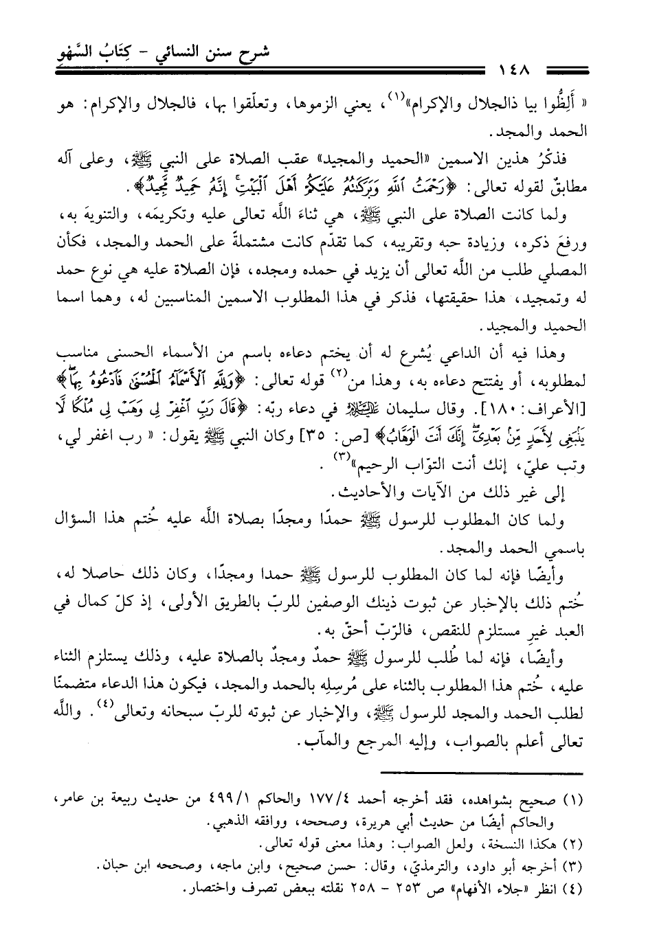 "أَلِظُّوا بيا ذالجلال والإكرام" (¬1)، يعني الزموها، وتعلّقوا بها، فالجلال والإكرام: هو الحمد والمجد.